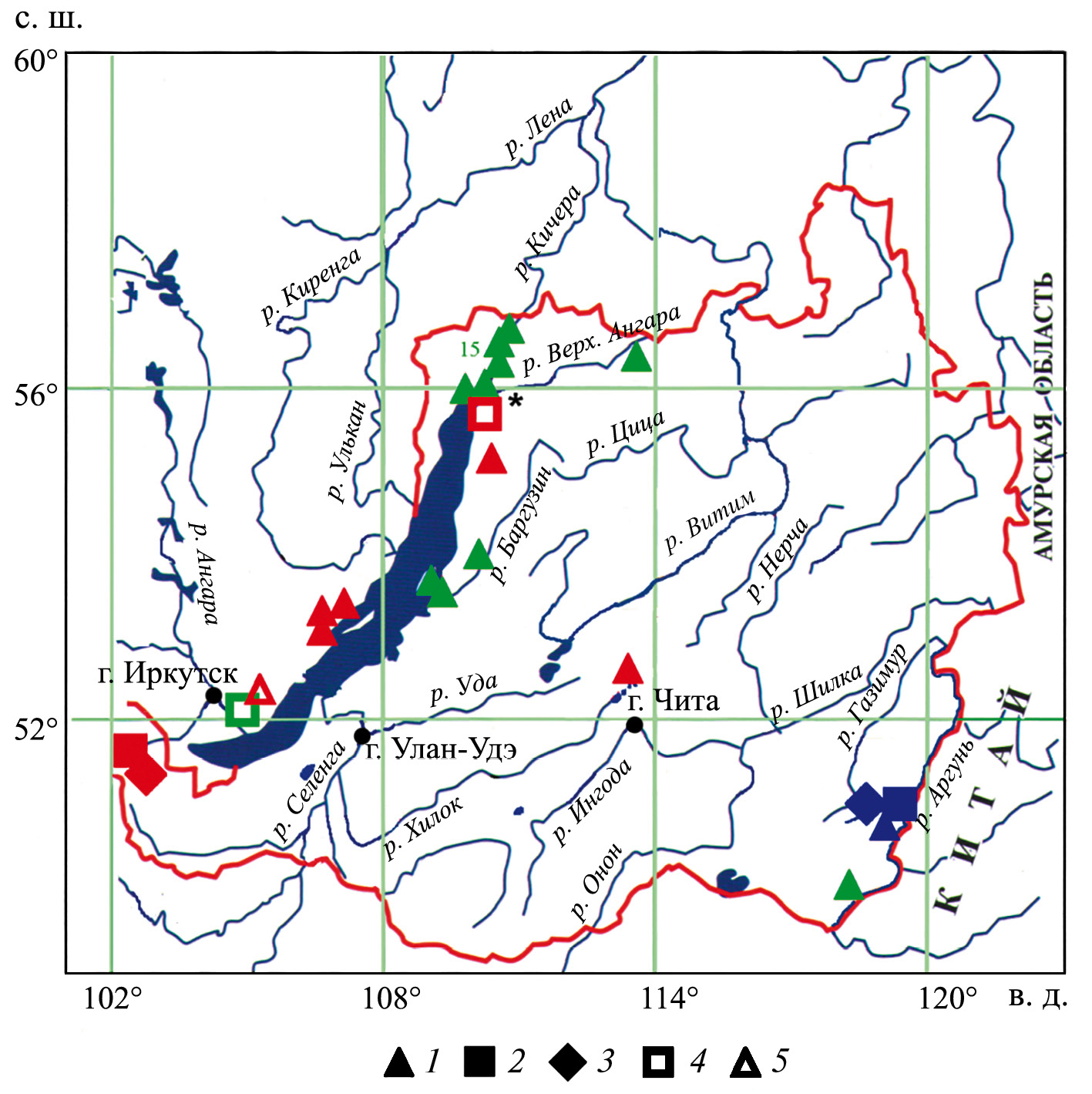 Рис. 1. Распространение видов Najadaceae в Забайкалье: 1 – Caulinia flexilis, 2 – Najas major, 3 – Caulinia minor, 4 – Najas marina, 5 – Caulinia tenuissima. Красным цветом обозначены данные “Флоры Сибири” (Ханминчун, 1988), зеленым — находки после 2000-х годов (Горюнова, Скворцова, 2004; Азовский, Чепинога, 2007; Аненхонов, Пыхолова, 2010; Чепинога и др., 2013; Красная ..., 2013, 2017; Чепинога, 2015; Степанцова и др., 2022), синим — наши находки; * – ошибочное указание Najas marina во “Флоре Сибири” (Ханминчун, 1988).