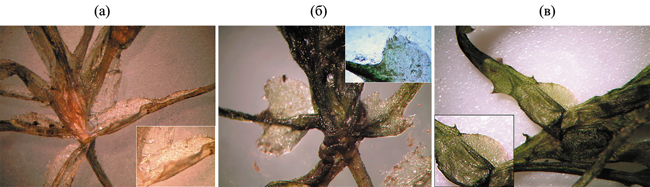 Рис. 2. Различие Caulinia flexilis (а), C. minor (б) и Najas major (в) по форме влагалищ листьев и наличию зубцов на них.