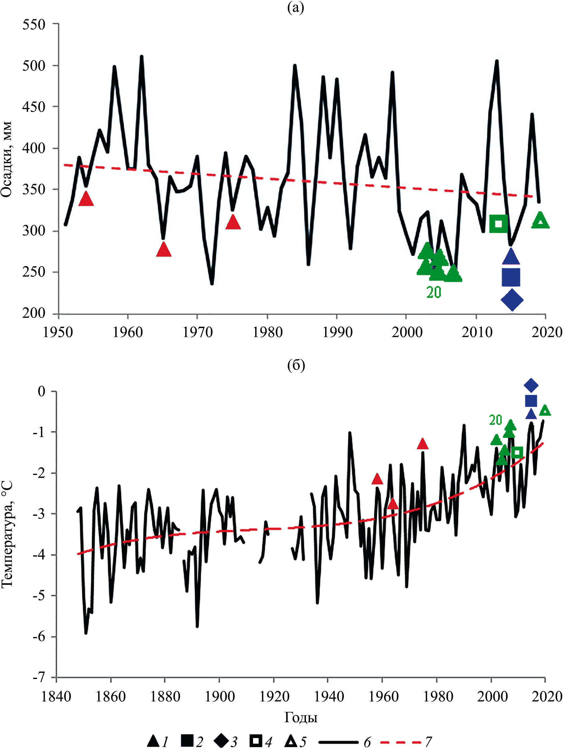 Рис. 4. Многолетние изменения годовых сумм атмосферных осадков в Забайкалье по данным из юго-восточной части (а) и многолетние изменения средней годовой температуры воздуха по данным метеостанции Нерчинский Завод (б). 1 – Caulinia flexilis, 2 – Najas major, 3 – C. minor, 4 – Najas marina, 5 – Caulinia tenuissima, 6 – исходный ряд данных (по: Обязов и др., 2022), 7 – линейный тренд.