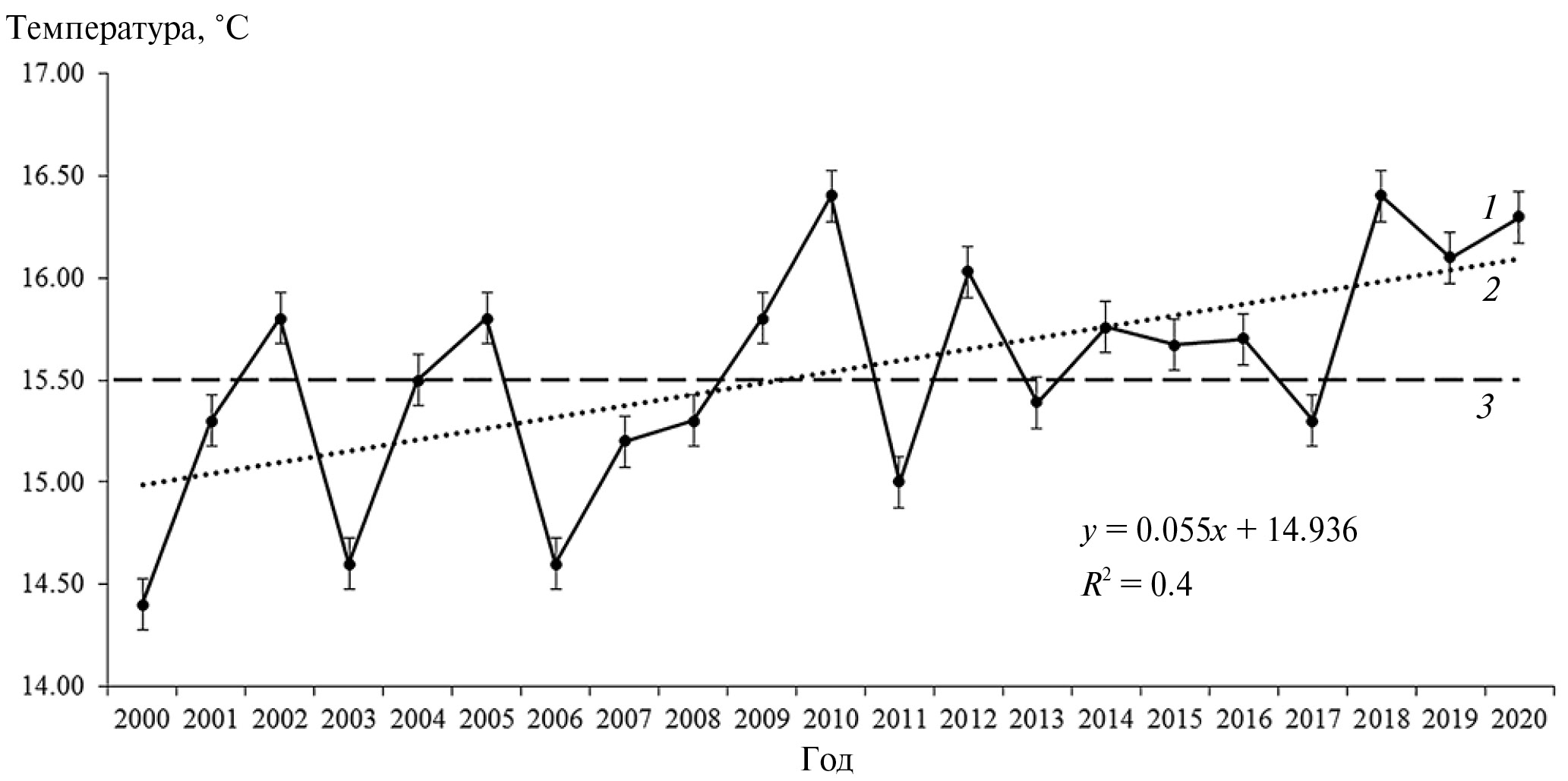 Рис. 2. Изменения среднегодовой температуры воды (Tср) за период с 2000 по 2020 гг. (1), среднеквадратические отклонения, линия тренда (2), среднемноголетняя ТПМ за период исследования (3).
