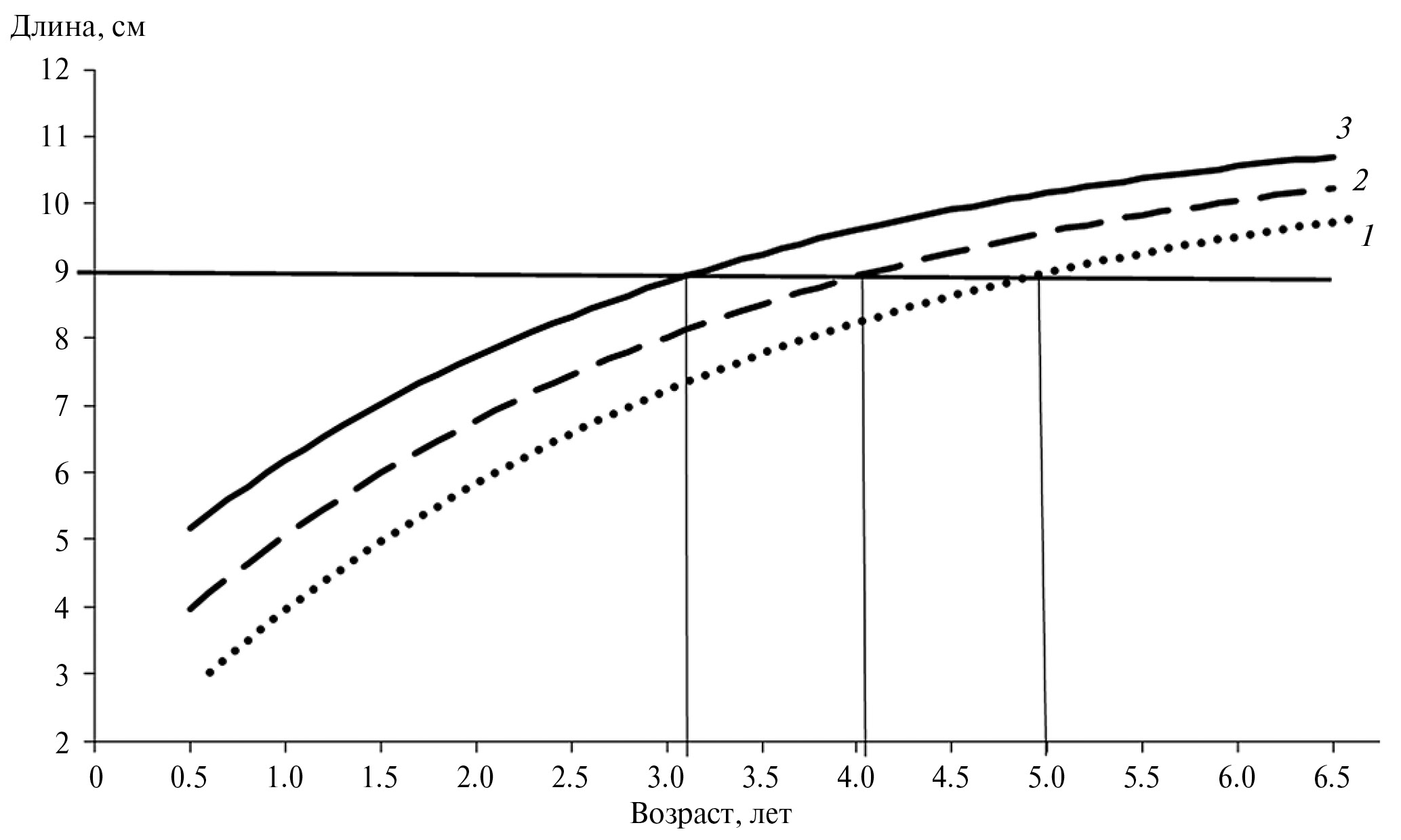Рис. 3. Рост черноморского шпрота, обитающего в прибрежных водах юго-западного Крыма. 1 – 2014–2020 гг.; 2 – 2008–2013 гг.; 3 – 2000–2007 гг.