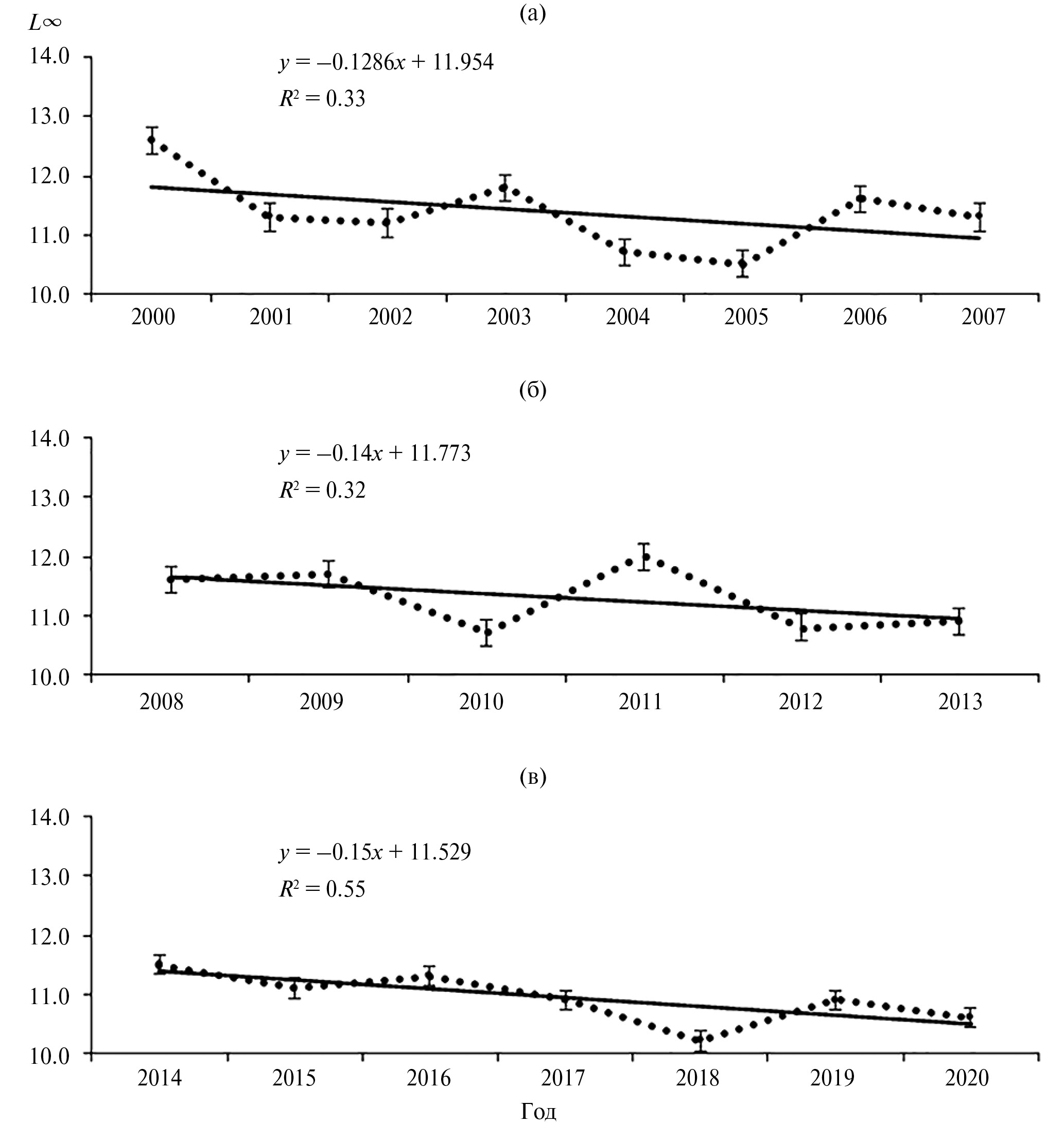 Получены зависимости предельной длины L∞ от среднегодовой ТПМ в исследуемые периоды (рис. 4). Среднее значение асимптотической длины за 2000–2020 гг. было 11.2 ± 0.582 см. Анализ линий трендов показал, что асимптотическая длина шпрота за исследуемый период 2000–2020 гг. уменьшалась (рис. 4). Выявлена отрицательная корреляционная связь между изменениями L∞ и ТПМ (r = –0.86, p <0.001). Наибольшую скорость уменьшения наблюдали в период 2014–2020 гг. (угол наклона тренда k = –0.15 см/год) по сравнению с 2000–2007 и 2008–2013 гг. (k = –0.13 и k = –0.14 см/год соответственно) (рис. 4).