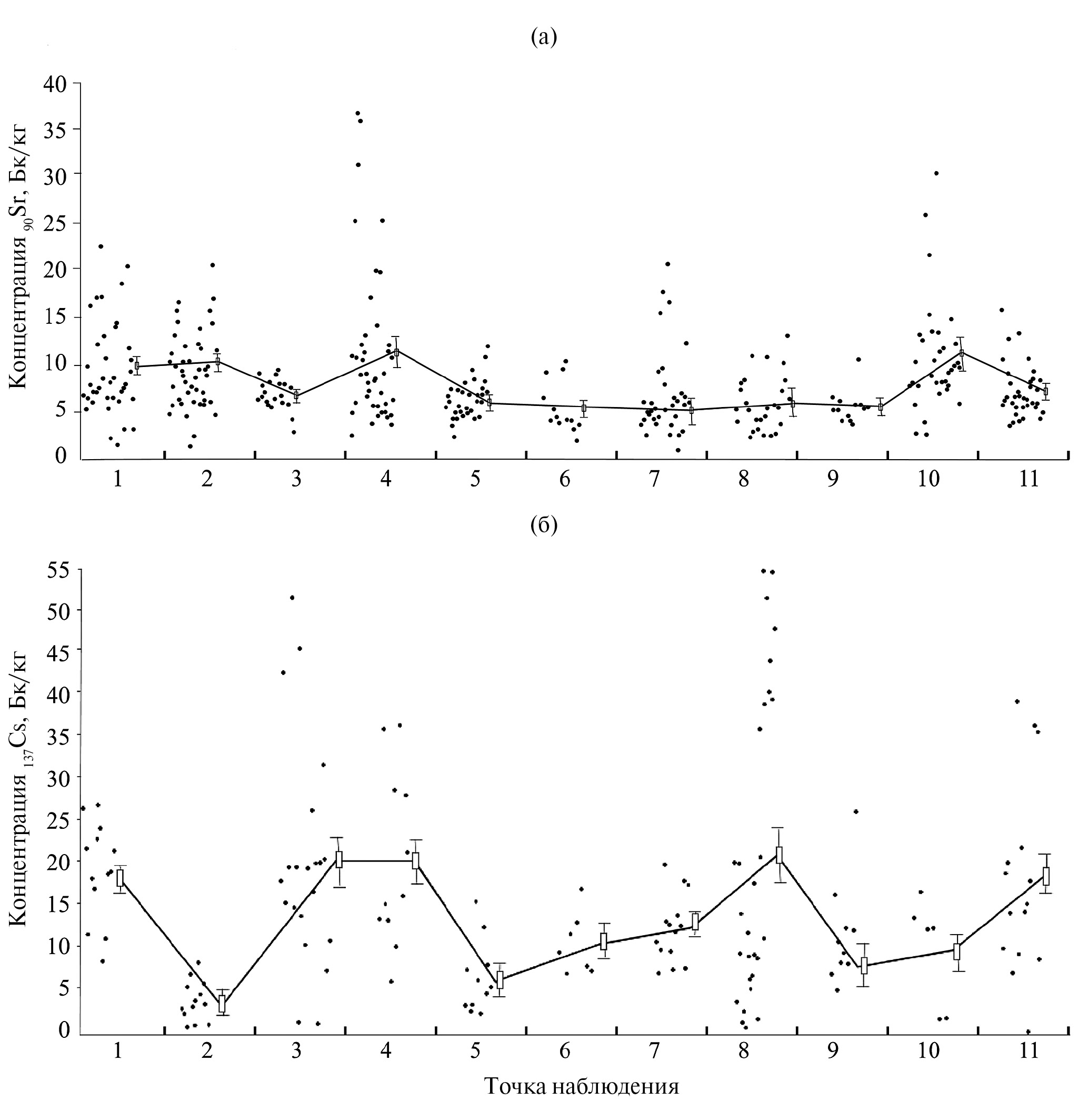 Рис. 2. Индивидуальные и средние концентрации 90Sr (а) и 137Cs (б) у лягушек, отобранных на исследуемых территориях Среднего Урала.