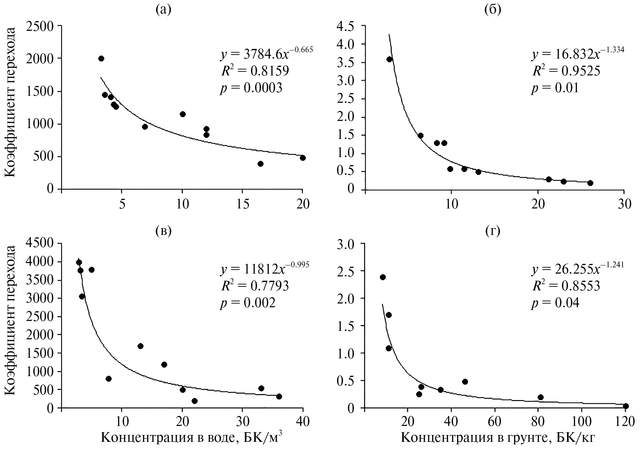 Рис. 4. Коэффициенты перехода 90Sr и 137Cs в организм лягушек в зависимости от концентрации радионуклида в среде обитания из воды (а, в) и грунта (б, г) соответственно.