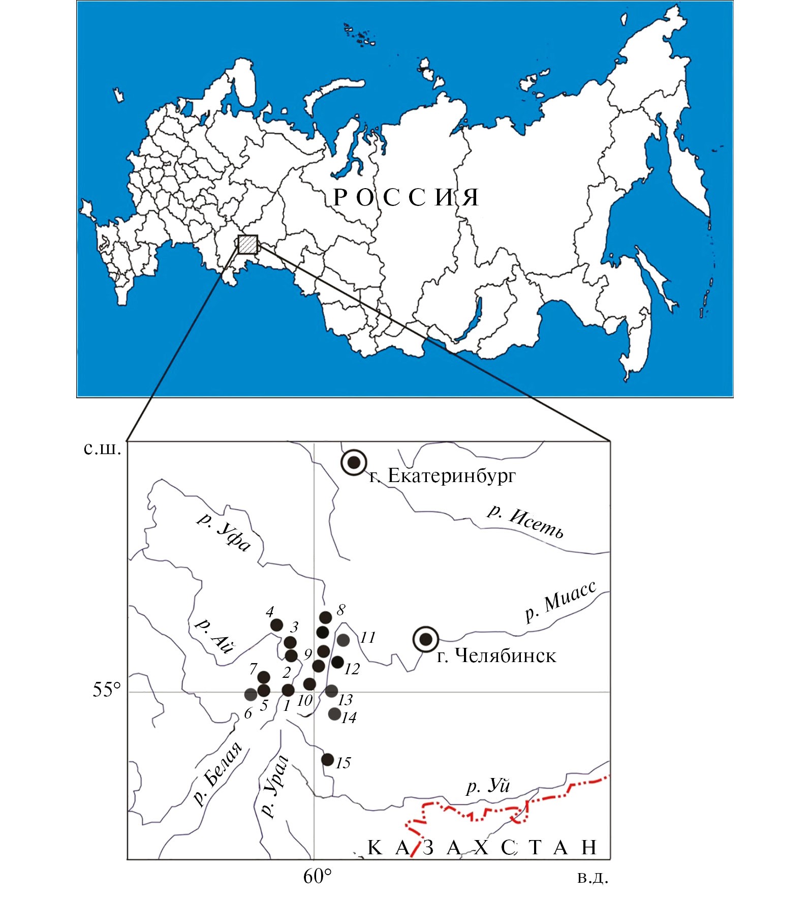 Рис. 1. Карта-схема местонахождений стоматоцист в планктоне водоемов горно-лесной зоны Южного Урала. 1 – вдхр. Верхнеайское на р. Ай, 2 – Златоустовский гор. пруд на р. Ай, 3 – Тесьминское вдхр. на р. Тесьма, 4 – Кусинский гор. пруд на р. Куса; 5 – Саткинское вдхр. на р. Большая Сатка; 6 – Бакальское (Малосаткинское) вдхр. на р. Малая Сатка; 7 – Саткинский городской пруд на р. Большая и Малая Сатка (Волго-Камский речной бассейн); 8 – оз. Барахтан, Богородский пруд, вдхр. Киалимское на р. Киалим, пруд Тыелга на р. Тыелга, 9 – оз. Тургояк и дериваты, оз. Кошкуль, 10 – пруд Хребет на р. Сыростан, 11 – оз. Сириккуль, оз. Карматкуль, 12 – оз. Миассово, 13 – оз. Ильменское, р. Черемшанка, 14 – р. Сорокина, 15 – Уйский пруд на р. Уй (Обский (Тоболо-Исетский) речной бассейн).