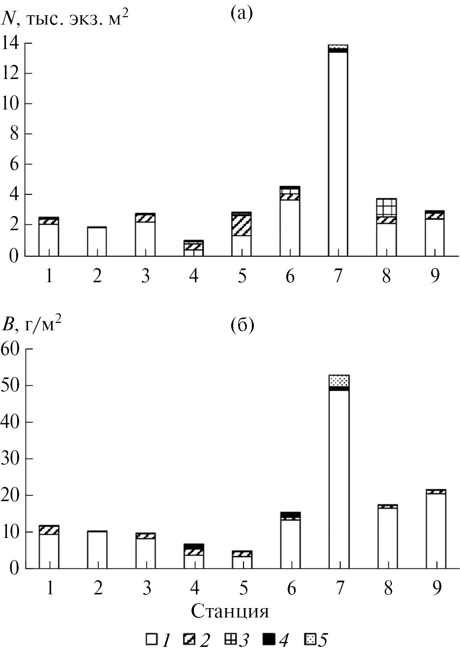 Примечание. Над чертой – численность, экз./м2, под чертой – биомасса, г/м2, “–” – отсутствие вида.