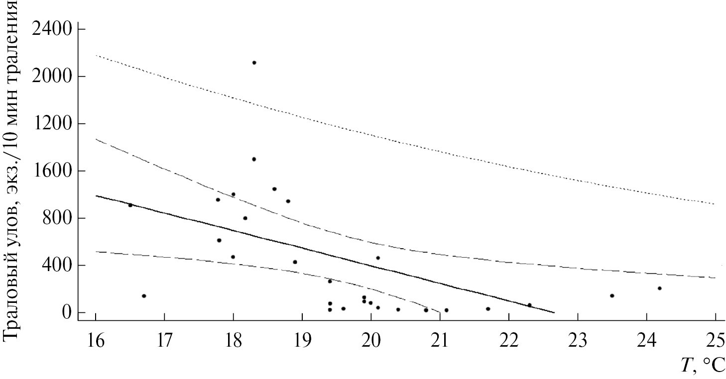 Рис. 1. Зависимость урожайности популяции снетка Рыбинского водохранилища от среднемесячной температуры воды (T) в июле (r = –0.43, p = 0.01).