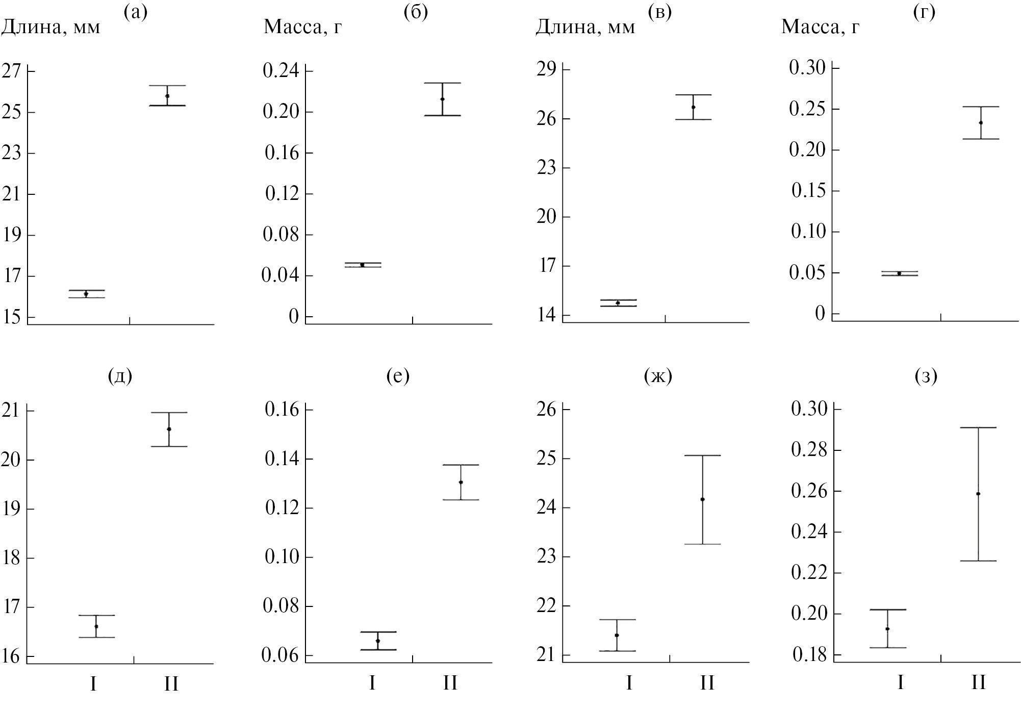 Рис. 6. Рост молоди в прибрежных скоплениях: уклейки (а, б), густеры (в, г), плотвы (д, е), окуня (ж, з) в 1980-е (I) и 2010-е (II) годы.