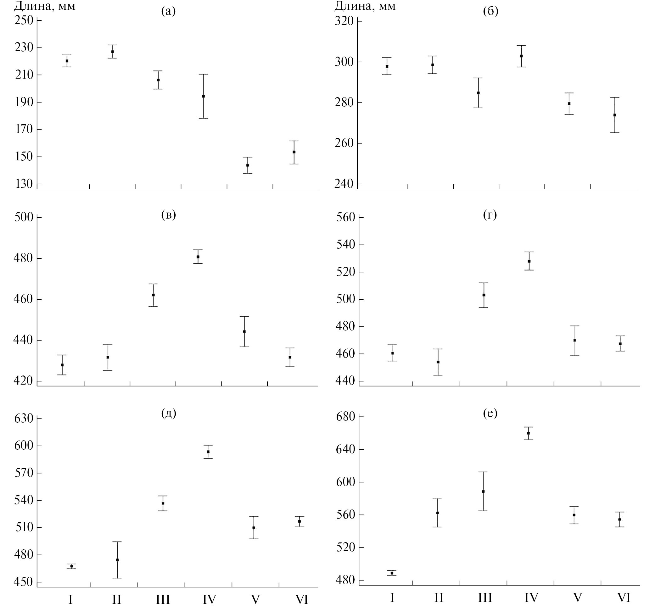 Рис. 8. Динамика средней длины судака разных возрастных групп с 1950-х по 2000-е годы (I–VI): а– 1+; б – 2+; в – 5+; г – 6+; д – 7+; е – 8+.