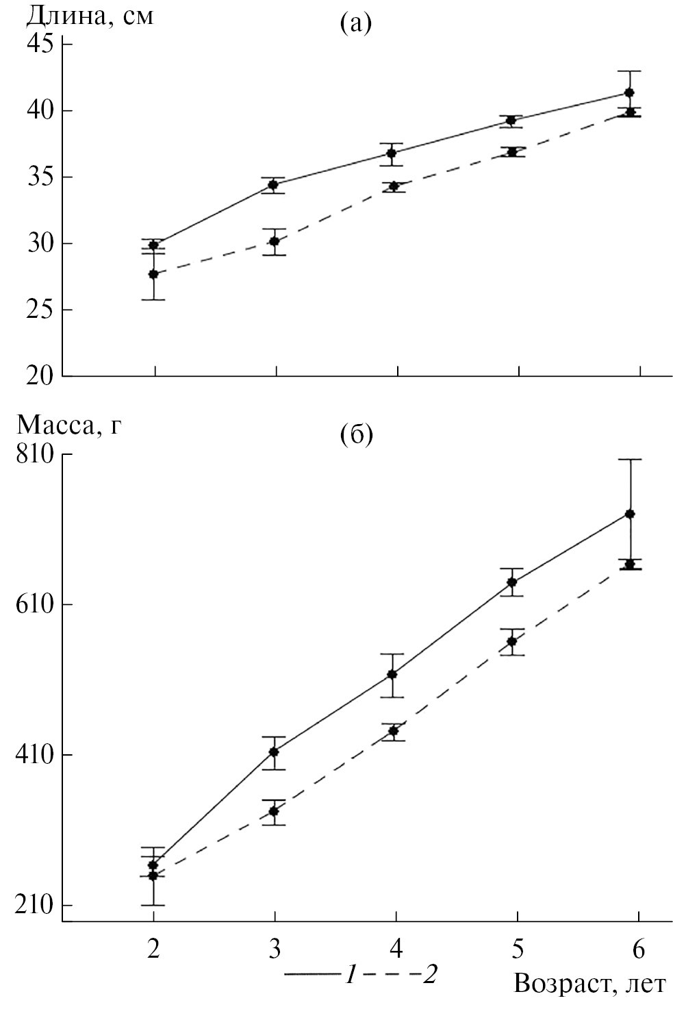 Рис. 4. Длина (а) и масса (б) особей налима различных возрастных групп в уловах из промысловых ловушек в 1980-х (1) и 2000-х (2) годах.