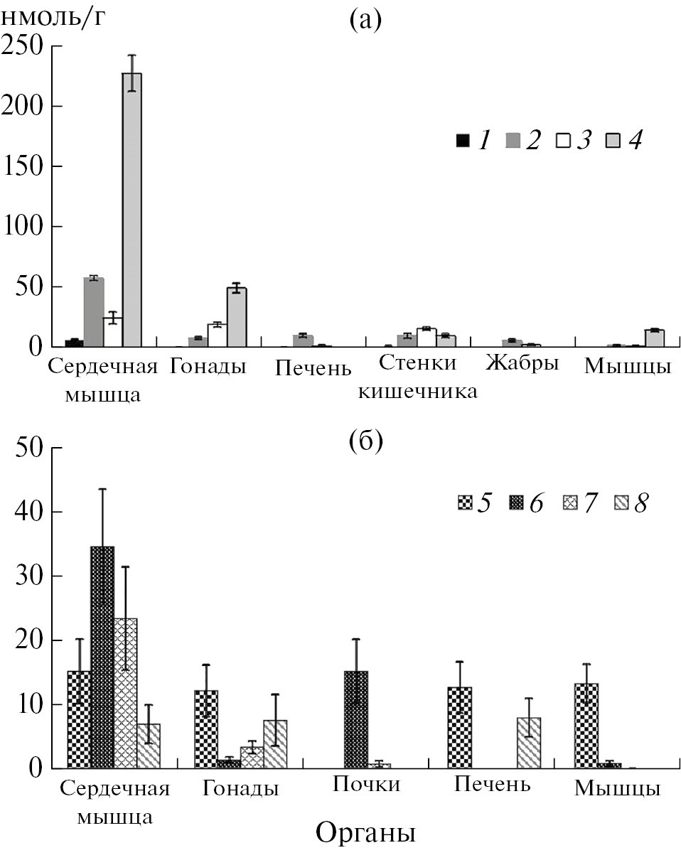 Количественное содержание БАСС у беспозвоночных. Результаты количественного определения стероидных гормонов в теле и/или в отдельных органах беспозвоночных животных на грамм сырой массы представлены в табл. 2, 3. В теле разных видов беспозвоночных гидробионтов концентрации стероидов варьировали незначительно и были сопоставимы (табл. 2), за исключением желетелого планктона, у которого диапазон концентраций гидрокортизона многократно шире, чем у остальных гидробионтов. Это может быть обусловлено отсутствием у этой группы животных распределительной системы, а также высокой долей содержания воды в теле. Концентрации глюкокортикоидов (нмоль/г) в теле беспозвоночных животных с распределительным (кровеносным) аппаратом колебались незначительно (табл. 2).