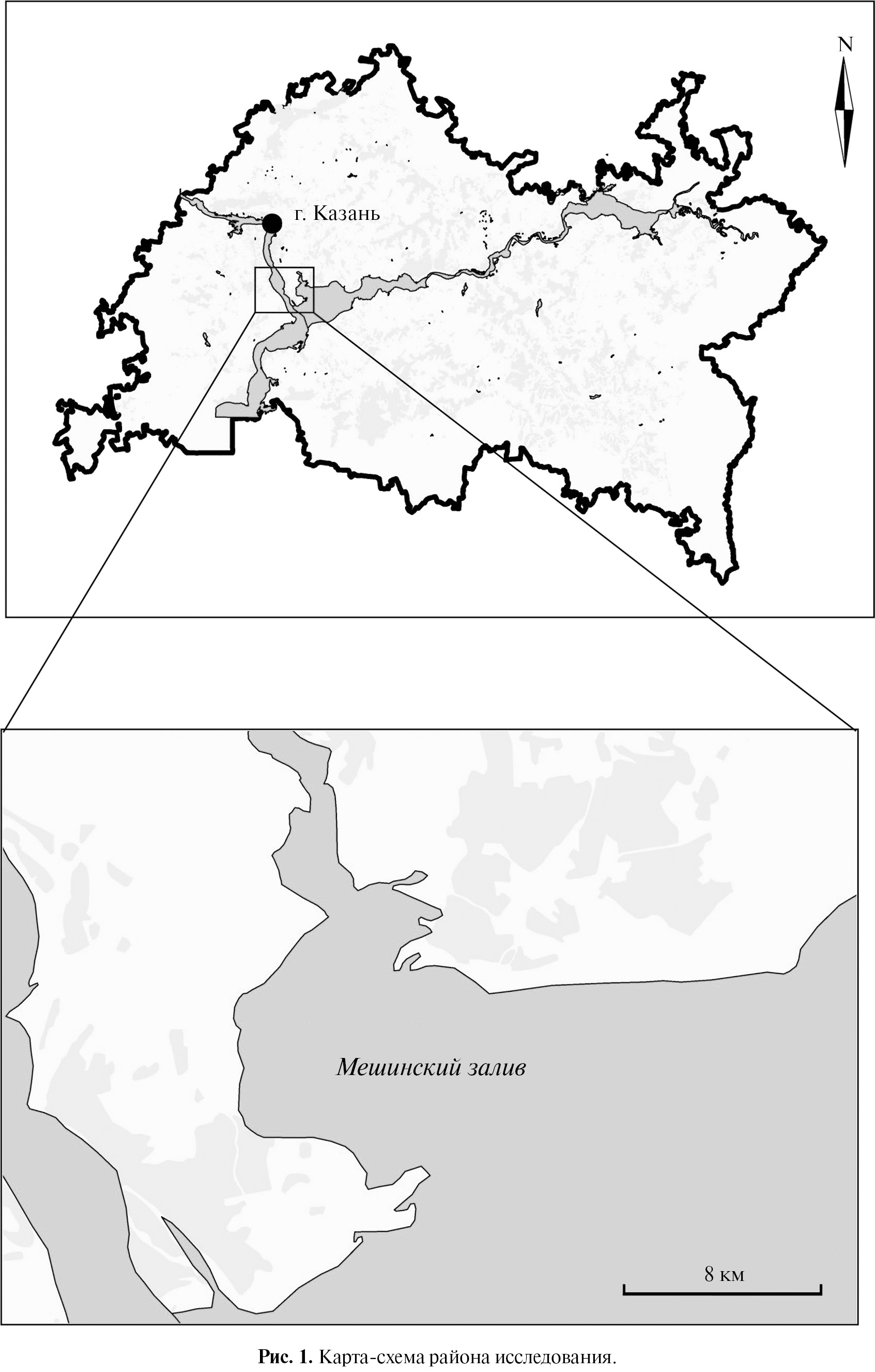 Мешинский залив находится в северной части Волжско-Камского плеса, имеет воронкообразную форму, сужаясь к северу, и представляет собой затопленное водное расширение р. Меша и ее пойменных приустьевых участков площадью ~120 км². Залив имеет большое количество мелководных участков и островов, особенно в его предустьевой части, которые представляют собой бывшие пойменные дюны и луговые террасы, расположенные в основном вдоль водораздельной гряды между руслами рек Меша и Камы (Структура…, 1980). В прибрежной части Мешинского залива нерестится в среднем ~40% всего рыбного населения Куйбышевского водохранилища, кроме нереста здесь происходит и нагул рыбы (Северов и др., 2018).