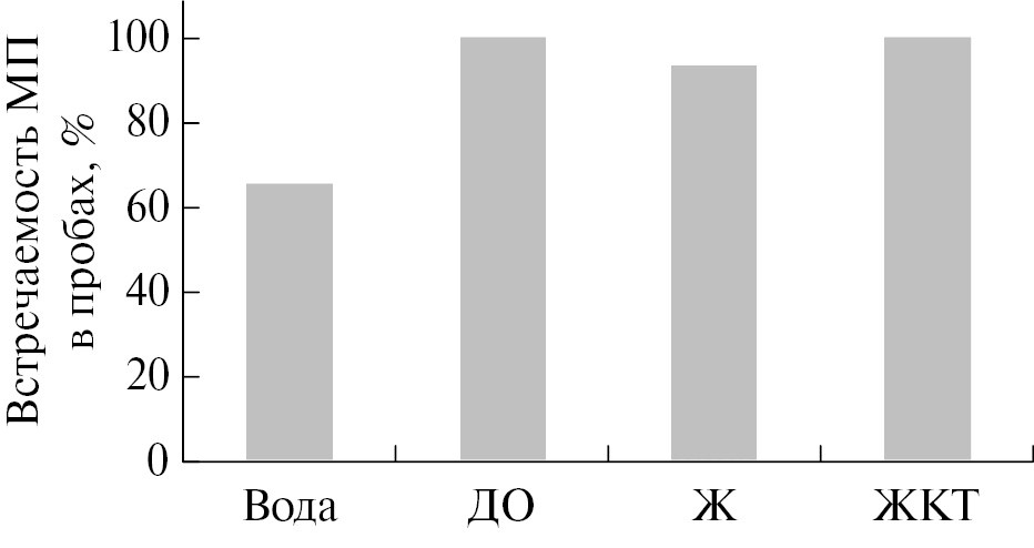 Анализ полученных данных показал, что МП был обнаружен во всех средах. Частота встречаемости МП в пробах воды, ДО, жабрах и ЖКТ рыбы различалась (рис. 2). В воде из 20 отобранных проб воды МП был выявлен в 13 (65%), из 15 проб жабр рыб МП отмечен в 14 (93%), в ДО и ЖКТ рыб МП обнаружен во всех проанализированных пробах (100%).
