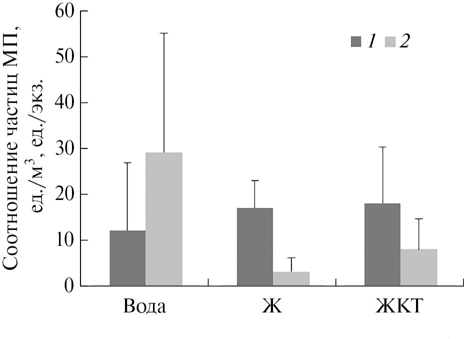 Рис. 5. Сезонное содержание МП в пробах воды (ед./м3), жабрах Ж и ЖКТ рыб (eд./экз.). 1 – весна, 2 – осень.