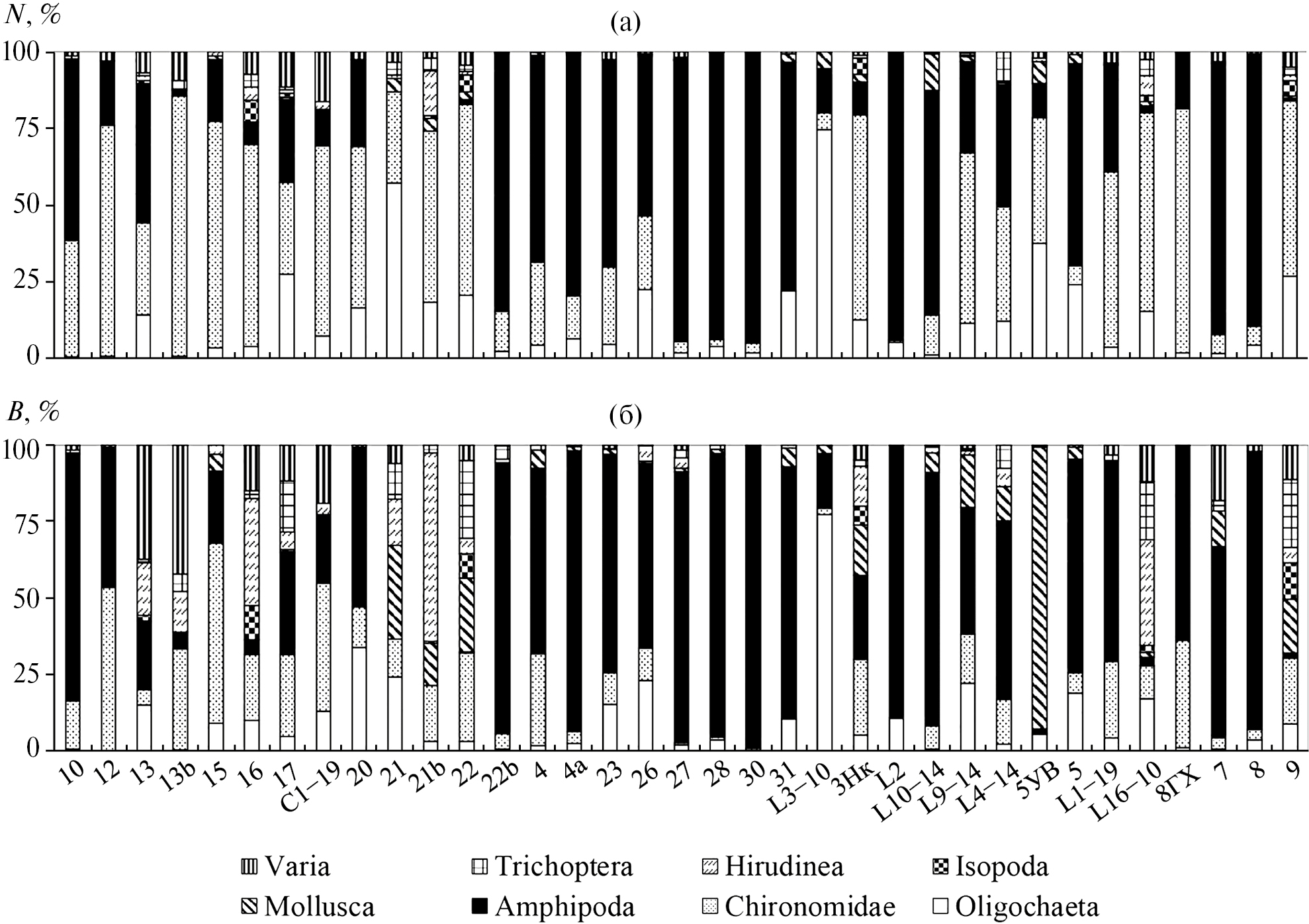 N, экз./м2 | B, г/м2 | N, экз./м2 | B, г/м2 | N, % | B, % | |
