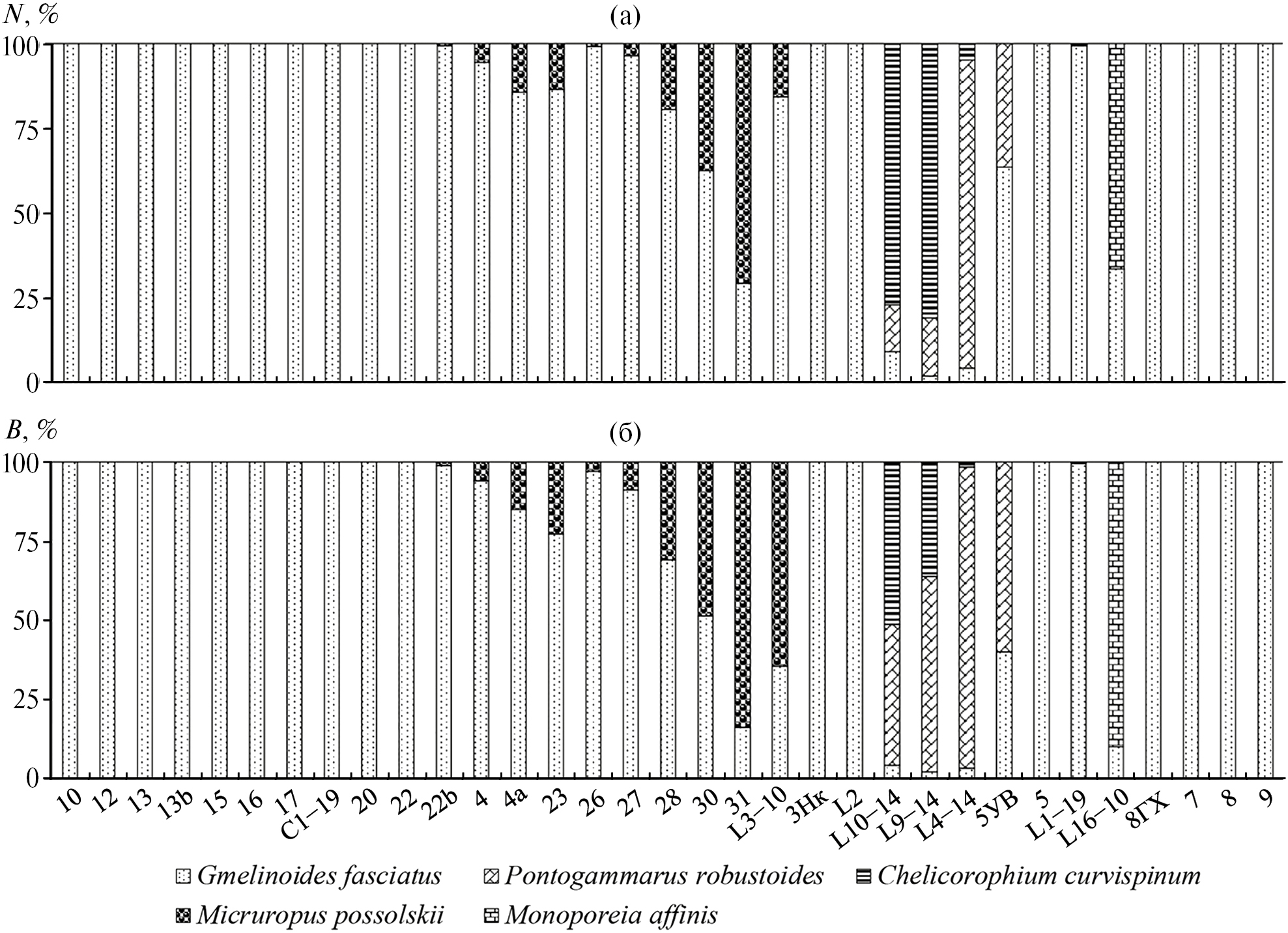 В целом методика исследования соответствовала таковой, изложенной в (Руководство…, 1983). Для сбора проб литоральных макробеспозвоночных в зарослевых биотопах использовали трубчатый пробоотборник Панова–Павлова с площадью сечения 0.125 м2 (Панов, Павлов, 1986). Для сбора на песчаных грунтах и в Щучьем заливе применяли дночерпатель Петерсена (Literature…, 2003) (площадь захвата 1/40 м2; по две выемки в каждой точке). Пробы грунта промывали через капроновый газ с диаметром ячеи 125 мкм и фиксировали формалином до его конечного содержания 4%. В лаборатории пробы разбирали, выбранные организмы сортировали по группам и видам, подсчитывали и повторно фиксировали 70%-ным этиловым спиртом. Массу обнаруженных животных определяли на аналитических весах Sartorius CPA225D, перед взвешиванием беспозвоночных обсушивали на фильтровальной бумаге. Идентификацию видовой принадлежности амфипод проводили по (Определитель…, 2016) и Базикаловой А.Я. (1951) с использованием стереоскопического микроскопа Zeiss STEMI DV4.
