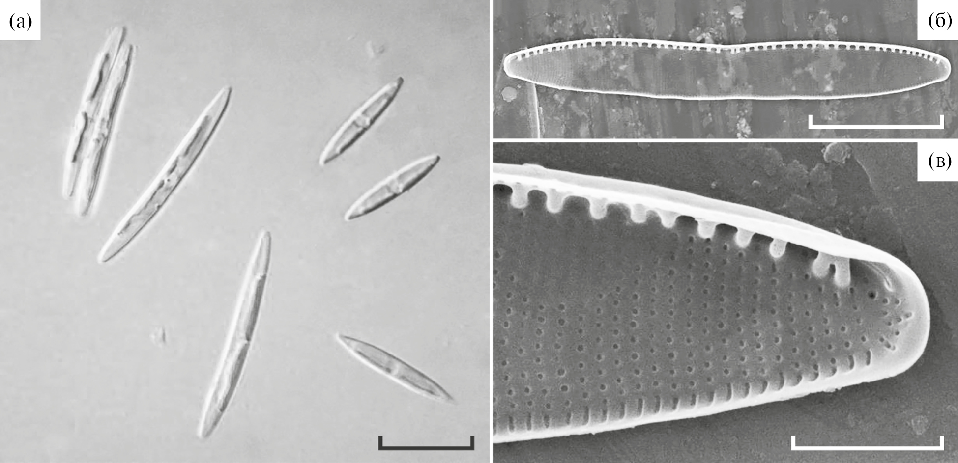 Рис. 1. Диатомовая водоросль Nitzschia cf. thermaloides Hustedt: а – родительские и первые постинициальные клетки новой генерации, световая микроскопия, дифференциально-интерференционный контраст; б, в – створка и фрагмент створки с внутренней стороны, СЭМ. Масштаб: а – 20 мкм, б – 10 мкм, в – 2 мкм.