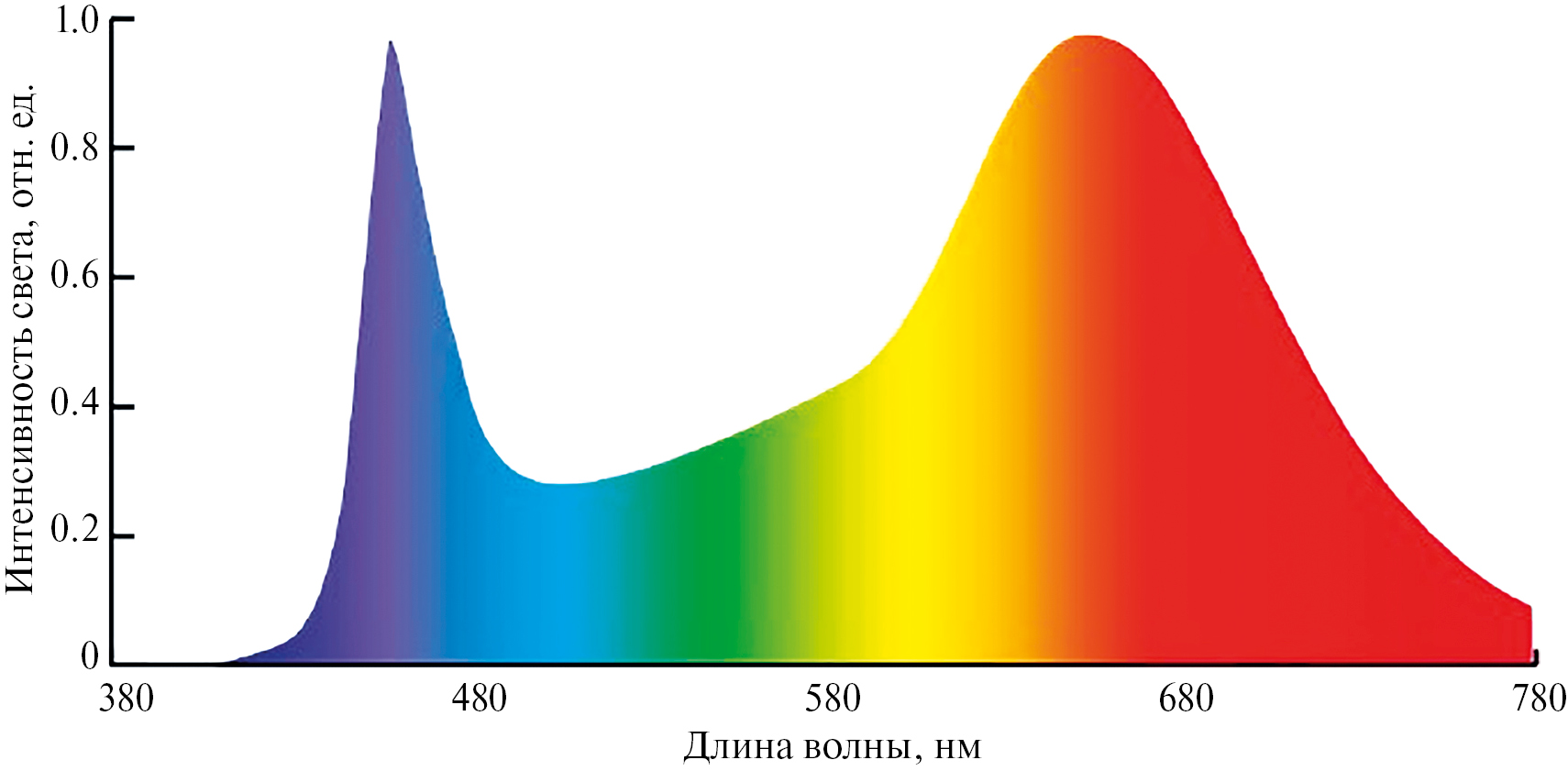 Клоны выделяли микропипеточным способом и содержали в модифицированной среде ESAW в стеклянных колбах объемом 100 мл (Andersen et al., 2005; Полякова и др., 2018). Соленость, соответствующую той, при которой клетки были обнаружены в пробах, создавали путем разбавления исходной среды (36‰) дистиллированной водой или добавляя к ней хлорид натрия. Соленость измеряли рефрактометром RHS-10ATC (Китай). В экспериментах с освещенностью использовали светильник светодиодный для растений ЭРА LLED-05-T5-FITO-14W-W (Китай), в спектре излучения которого доминируют синий и оранжево-красный цвета (рис. 2). Освещенность измеряли люксметром Ю-117 (Россия). Уровень освещенности создавали за счет удаления от источника света.