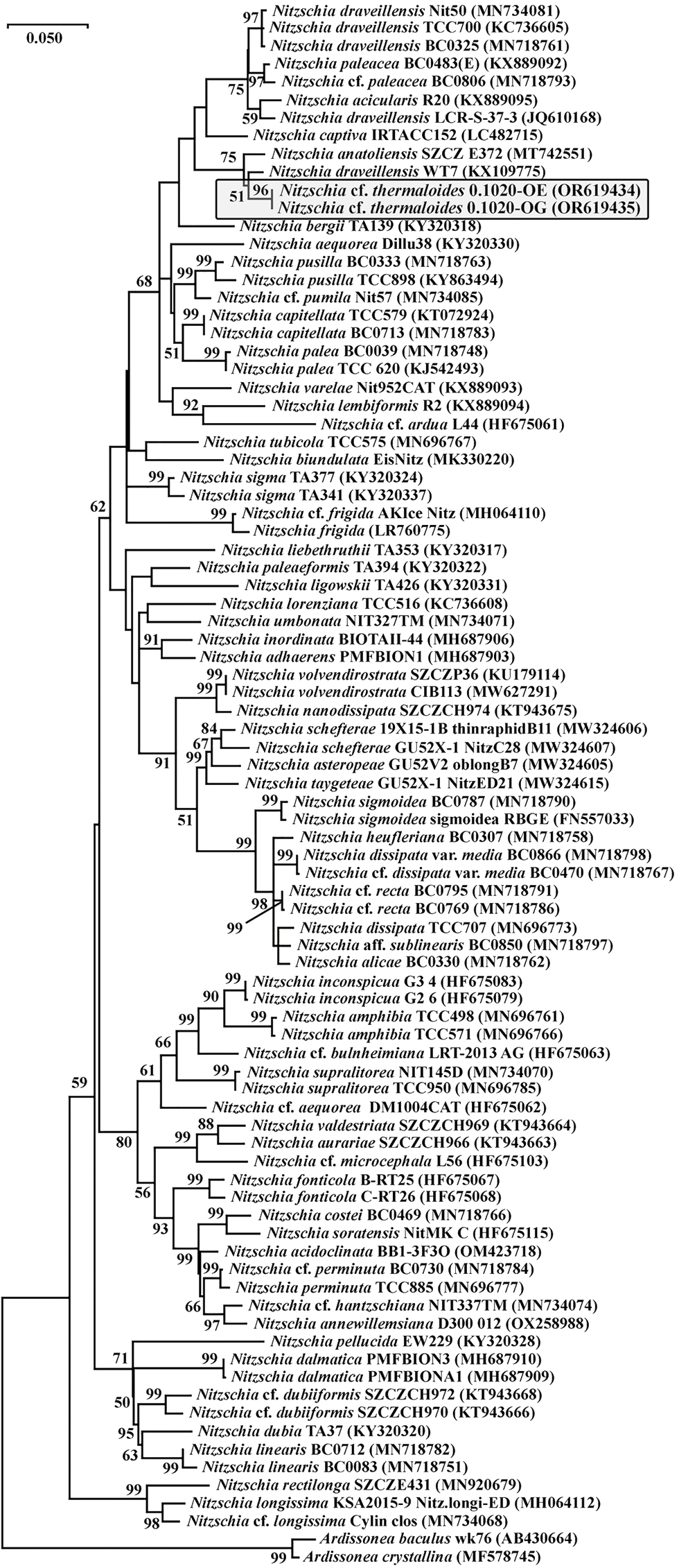К сожалению, молекулярные данные для N. thermaloides в доступных базах данных не представлены. На филогенетическом дереве, построенном на основании изменчивости фрагмента гена rbcL хпДНК, исследованные клоны 0.1020-OE и 0.1020-OG находились в одной кладе с Nitzschia anatoliensis Górecka, Gastineau & Solak и одним из изолятов Nitzschia draveillensis Coste & Ricard (WT7) со средними значениями бутстреп поддержек (рис. 3). Другие штаммы N. draveillensis не кластеризовались с этой группой и были в других различных кладах.