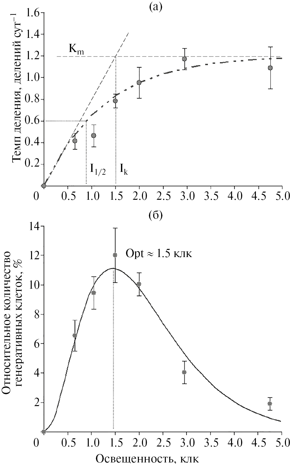 Для аппроксимации зависимости темпа вегетативного деления клеток от освещенности использовали уравнение (Финенко, Ланская, 1971):