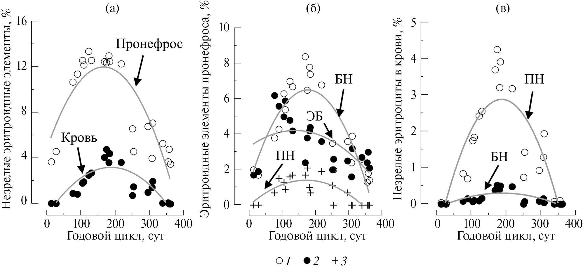 На рис. 2 представлены полигоны распределения значений общего числа незрелых эритроцитов и отдельных эритроидных форм в пронефросе и крови камбалы-глоссы, полученные на протяжении годового цикла. Очаг эритропоэза в пронефросе камбалы-глоссы достигал максимальных размеров в марте–июле (90–210 сут). На незрелые эритроидные формы приходилось 11–17% клеточной массы отпечатка. Эритроидный росток представляли в основном ЭБ и БН. При этом максимальное число ЭБ в гемопоэтической ткани наблюдали в более ранний период годового цикла: март–апрель (90–120 сут). Уровень ПН был минимален (≤2% клеточной массы). В циркулирующей крови популяцию незрелых эритроцитов представляли ПН и БН. Максимум их содержания в основном приходился на май–июль (150–210 сут). В этот период уровень незрелых эритроидных форм достигал 4–6% общего числа клеток красной крови.