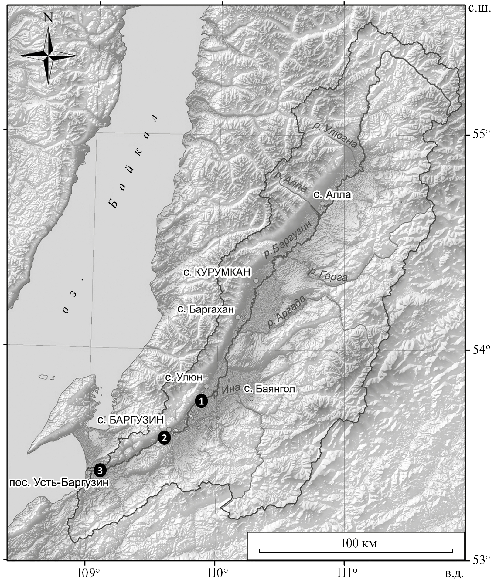 Рис. 1. Места отбора образцов рыб (● 1‒3) в р. Баргузин (Восточное Прибайкалье).