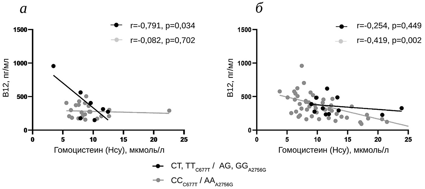 Рис. 3. Взаимосвязь между содержанием витамина В12 и уровнем гомоцистеина у испытуемых с учётом сочетания генотипов по полиморфизмам C677T гена MTHFR и A2756 гена MTR. а – Дети (контрольная группа и пациенты детского возраста в стадии дебюта РС); б – взрослые (контрольная группа и взрослые пациенты с продолжительностью заболевания не более полугода (дебют РС)). Результаты корреляционного анализа представлены в виде коэффициента корреляции Пирсона и значения p для уровня значимости 95%