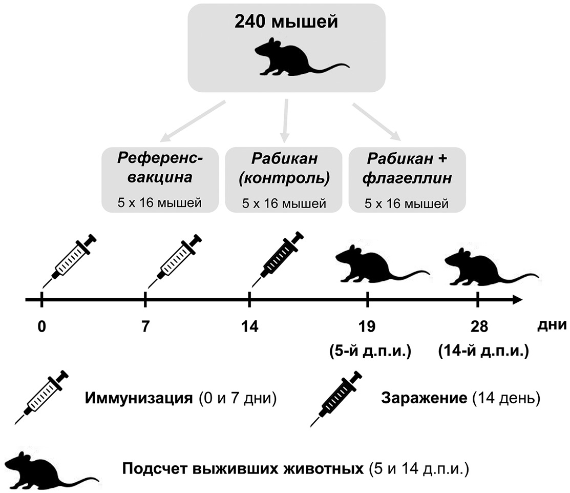 Рис. 3. Схематическое изображение эксперимента по оценке протективной активности инактивированной вакцины против вируса бешенства, содержащей флагеллин в качестве адъюванта; д.п.и. – день после инфекции