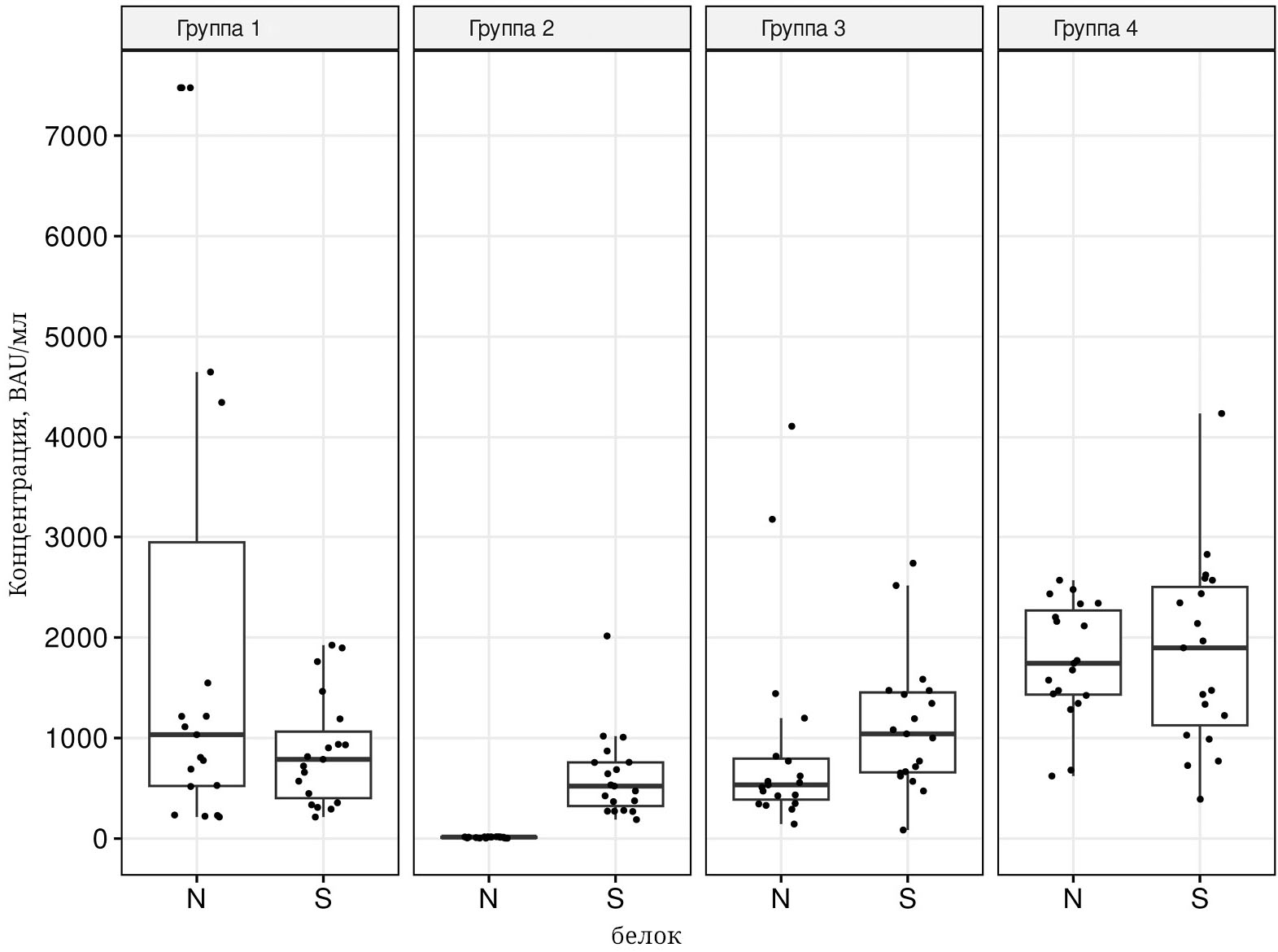 Из рисунка видно, что уровень анти-N и анти-S антител варьировал в разных группах. Так, у перенёсших COVID-19 однократно (группа 1) уровень анти-N антител сильно варьировал, но не превышал значимо уровень анти-S антител. У вакцинированных «Спутник V» (группа 2) анти-N антител обнаружено не было, что вполне объяснимо отсутствием N-белка в составе этой вакцины. В группе 3 с гибридным иммунитетом (вакцинация через 6–12 мес. после перенесённого COVID-19) уровень IgG-антител к N-белку был значимо ниже (р = 0,018), чем уровень антител к S-белку. Кроме того, уровень анти-S антител был значимо выше (p = 0,004), чем в группе 2. В группе 4 с прорывным иммунитетом (дважды перенёсшие COVID-19) отмечается значимый прирост как анти-S антител (p = 0,0006), так и анти-N антител (p = 0,042) по сравнению с группой 1.