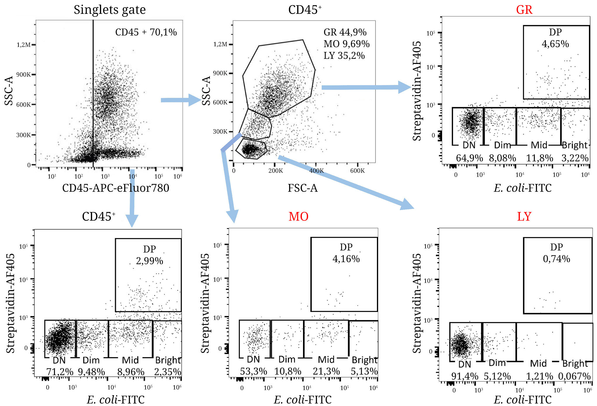 Рис. 2. Стратегия анализа и гейтирования для сортера Sony SH800: из единичных клеток (Singlets gate) выделяли лейкоциты (СD45+), далее эту популяцию сортировали по интенсивности флуоресценции и локализации бактерий (E. coli) на следующие категории: DN – двойная негативная популяция (нефагоцитировавшие клетки); Dim – клетки, флуоресценция которых не более чем на декаду выше, чем DN; Mid – клетки с умеренной интенсивностью флуоресценции (больше на декаду, чем у Dim); Bright – клетки с самой высокой интенсивностью флуоресценции; DP – двойная по FITC и AF405 позитивная популяция бактерий на поверхности (нижняя панель слева). Для анализа по субпопуляциям клетки гейтировали по гранулярности (SSC) и размеру (FSC) на гранулоциты (GR), моноциты (MO) и лимфоциты (LY). Расширенная информация по стратегии гейтирования приведена на рис. П2 Приложения