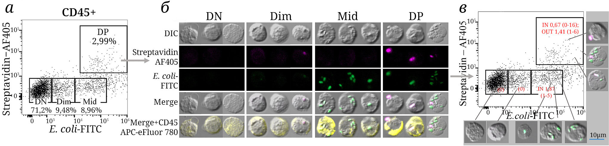 Рис. 3. Схема эксперимента по сортировке фагоцитирующих популяций лейкоцитов (CD45+) и анализа отсортированных фракций на конфокальном микроскопе. Отсортированные популяции (а) были проанализированы с использованием конфокальной микроскопии (б), где DN – двойная негативная популяция (0 бактерий); Dim – клетки, интенсивность флуоресценции которых не более чем на декаду больше, чем у DN (автофлуоресценция – 0 бактерий); Mid – клетки с умеренной интенсивностью флуоресценции, в пределах декады выше, чем у Dim (1–5 бактерий внутри клетки); DP – популяция, двойная позитивная по FITC и AF405 (гетерогенная – бактерии внутри и/или на поверхности клетки). Наложение флуоресцентных изображений (FITC, AF405) и DIC обозначено как Merge (в). Красными цифрами на графике справа указаны средние значения количества E. coli внутри (IN) и снаружи (OUT) лейкоцитов, в скобках показан разброс данных. Индивидуальные изображения клеток – примеры клеток с различным количеством E. coli в популяциях (б, в). Число независимых экспериментов n = 3