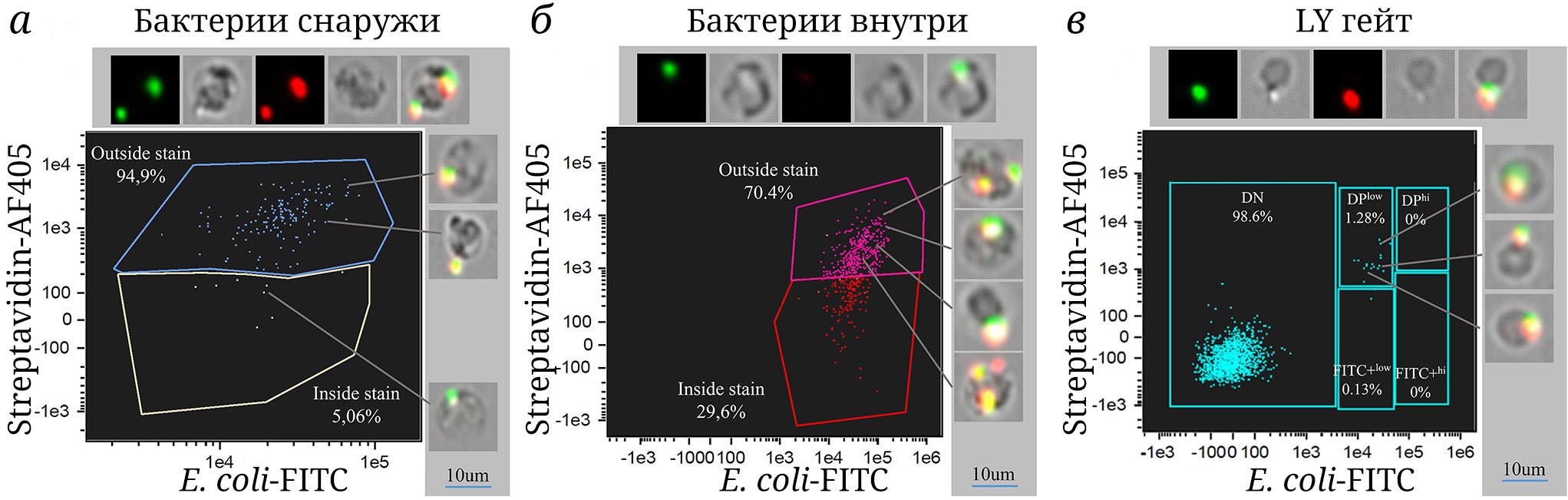 Рис. 5. Локализация бактерий относительно клеток по результатам анализа встроенной программы Amnis и двойного окрашивания. а – Бактерии, которые детектировались программой как находящиеся снаружи клеток. 94,9% этих клеток действительно были позитивны и по FITC, и по AF405, то есть бактерии адгезированы на поверхности фагоцитов. б – Бактерии, которые детектировались программой как находящиеся внутри клеток. Однако 70,4% из этих клеток были позитивны и по FITC, и по AF405, что, согласно двойному окрашиванию, указывает на локализацию бактерий на поверхности клеток. в – Лимфоцитарный (LY) гейт. Хотя программа детектирует некоторые клетки в популяции лимфоцитов как фагоцитирующие, все 1,28% клеток, согласно двойному окрашиванию, находились на поверхности. Верхние панели иллюстрируют (слева направо) каналы: FITC (E. coli), Brightfield 1, AF405 (biotin-streptavidin, E. coli), Brightfield 2 и наложение всех каналов. Правые панели визуализируют клетки, показанные в виде точек на графиках проточной цитометрии. Синей линией дана масштабная линейка для изображений клеток. Образцы поклеточного анализа изображений показаны на рис. П3 Приложения