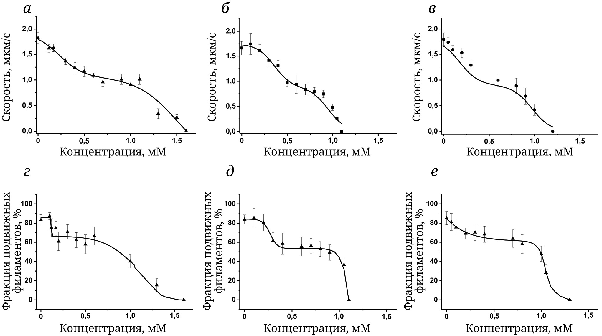 Статистический анализ. Зависимость скорости скольжения актина по миозину левого желудочка быка анализировали по двухфазной кривой «концентрация-эффект» (OriginPro). Статистический анализ и построение графиков проводили с использованием критерия Краскела–Уоллиса и программы PrizmaGraph или OriginPro, различия считали статистически значимыми при уровне достоверности p < 0,05.
