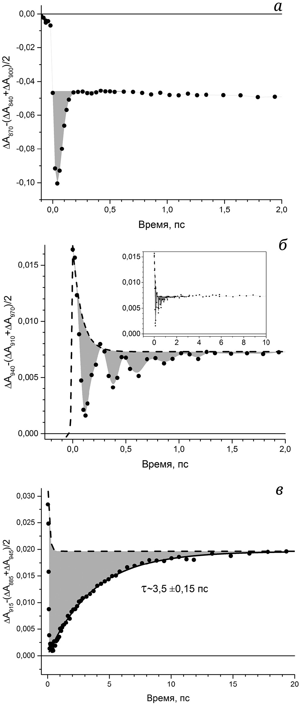 Рис. 2. Кинетические кривые изменений поглощения при 870 нм (а), при 940 нм (б) и при 915 нм (в) в РЦ Rba. sphaeroides, полученные методом интервалов при температуре 293 К. Вклад стимулированного излучения выделен на рисунке серым цветом. Сплошной линией показана аппроксимация кинетики при 915 нм одной экспонентой. Пунктиром показаны положительные изменения, связанные с вкладом выцветания полосы поглощения первичного донора Р. На вставке представлена кинетическая кривая при 940 нм на шкале времени от -0,5 до 10 пс