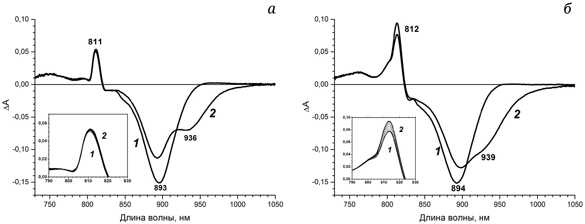 Рис. 5. Дифференциальные спектры поглощения РЦ Rba. sphaeroides дикого типа на задержке времени 60 фс (кривая 1) и 170 фс (кривая 2) (а) и РЦ тройного мутанта на задержке времени 80 фс (кривая 1) и 380 фс (кривая 2) (б), измеренные при температуре 100 К. На вставках (панели а и б) показана область полосы поглощения Р* при 810 нм. Величина положительной дисперсии зондирующего импульса в диапазоне длин волн 810–940 нм составляет ~100 фс