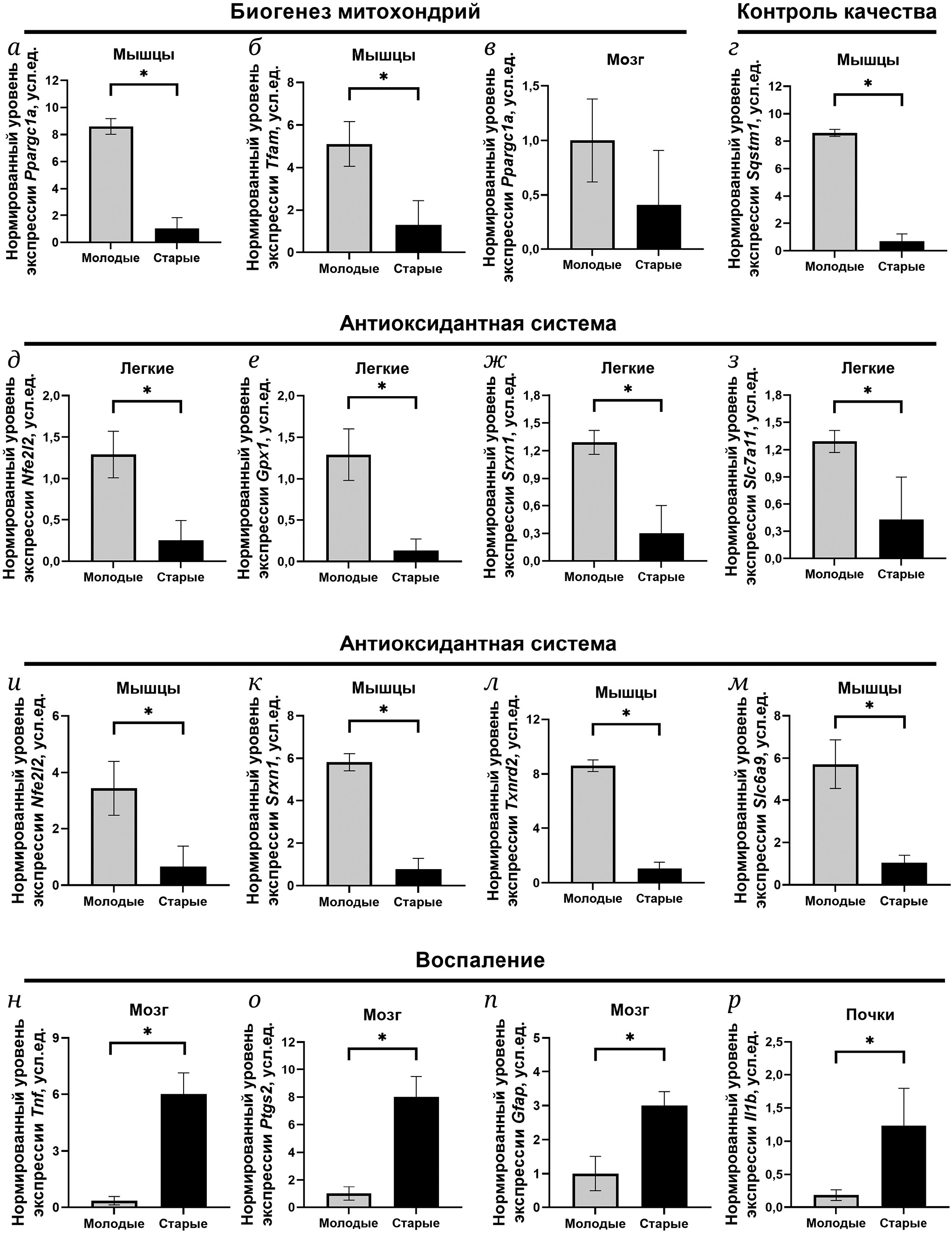 Старение негативно влияет на антиоксидантную систему клеток и на экспрессию генов белков, регулирующих биогенез и контроль качества митохондрий. В органах молодых и старых крыс была проанализирована экспрессия генов, ассоциированных с биогенезом митохондрий, системой контроля качества, антиоксидантной системой и воспалением (рис. 1). Было показано, что старение значительно изменяет экспрессию анализируемых генов, особенно в мозге, мышцах и лёгких (рис. 1). В частности, выявлено, что в мышцах и мозге с возрастом наблюдалось снижение уровня мРНК генов ферментов, регулирующих биогенез митохондрий (Ppargc1a, Tfam) (рис. 1, а–в). Возрастные изменения в мышцах были ассоциированы со снижением экспрессии гена Sqstm1, продукт которого участвует в контроле качества белков и органелл (рис. 1, г). В лёгких и мышцах старых крыс наблюдалось значительное снижение экспрессии генов, продукты которых являются компонентами системы антиоксидантной защиты, в частности, Gpx1, Srxn1, Txnrd2, Slc7a11, Slc6a9 (рис. 1, д–м). Наблюдаемые негативные возрастные изменения сопровождались также увеличением уровня маркеров воспаления, в частности, повышенной экспрессией Tnf, Ptgs2, Gfap, Il1b, прежде всего в мозге и почках (рис. 1, н–р).
