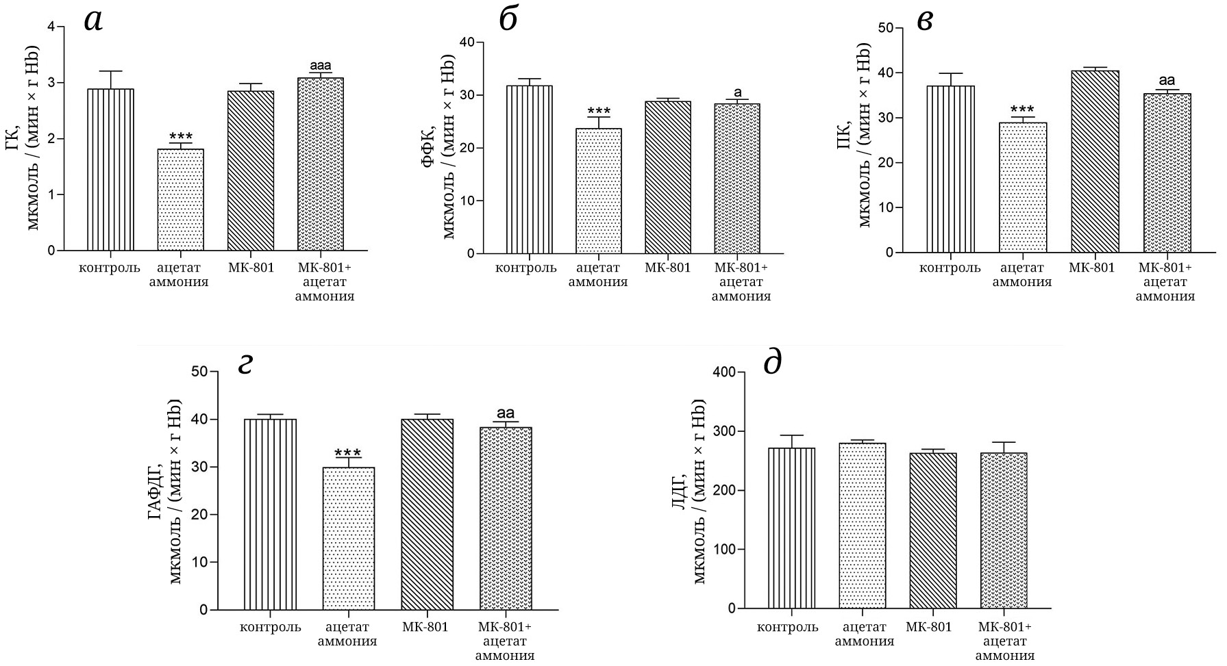Рис. 1. Активность ГК (а), ФФК (б), ПК (в), ГАФДГ (г) и ЛДГ (д) в эритроцитах крыс исследуемых групп (n = 10 для каждой группы). Крысам в/б вводили ацетат аммония (7 ммоль/кг, группа «ацетат аммония»), МК-801 (2 мг/кг в/б) вводился в одиночной инъекции (группа «МК-801») и за 15 мин до инъекции ацетата аммония (группа «МК-801 + ацетат аммония»). Крысам контрольной группы («контроль») вводился физиологический раствор. Время декапитации животных и методы определения активности ферментов указаны в разделе «Материалы и методы». Активность ферментов выражена в мкмоль/(мин × г Hb). Результаты представлены в виде «среднее ± стандартная ошибка среднего (SEM)». *** p < 0,001 по сравнению с животными контрольной группы; a – p < 0,05, aa – p < 0,01, aaа – p < 0,001 по сравнению с животными группы «ацетат аммония». Различия между группами анализировали с помощью метода ANOVA с поправкой Бонферрони