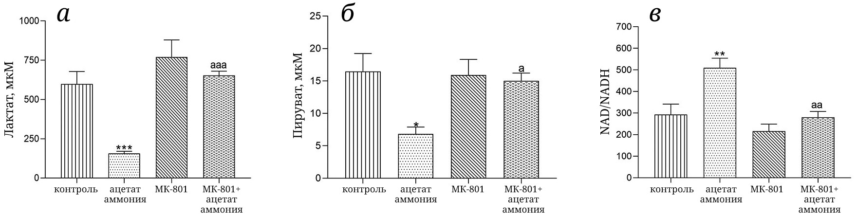 Рис. 2. Концентрация лактата (а), пирувата (б) и расчётное отношение NAD+/NADH (в) в эритроцитах животных исследуемых групп (n = 10 для каждой группы). Условия введения препаратов, доза, время декапитации указаны в подписи к рис. 1. Методы определения концентрации пирувата и лактата указаны в разделе «Материалы и методы». Концентрация метаболитов выражена в мкмоль/литр клеток (мкМ). Отношение NAD+/NADH рассчитывали по методу Williamson et al. [45]: NAD+/NADH = [пируват]/[лактат] × 1/k, где k – константа равновесия лактатдегидрогеназной реакции, равная 1,11 × 104. Данные выражены в виде «среднее значение ± SEM». * p < 0,05, ** p < 0,01, *** p < 0,001 по сравнению с животными контрольной группы; а – p < 0,05, aa – p < 0,01, aaа – p < 0,001 по сравнению с животными группы «ацетат аммония». Различия между группами анализировали с помощью метода ANOVA с поправкой Бонферрони