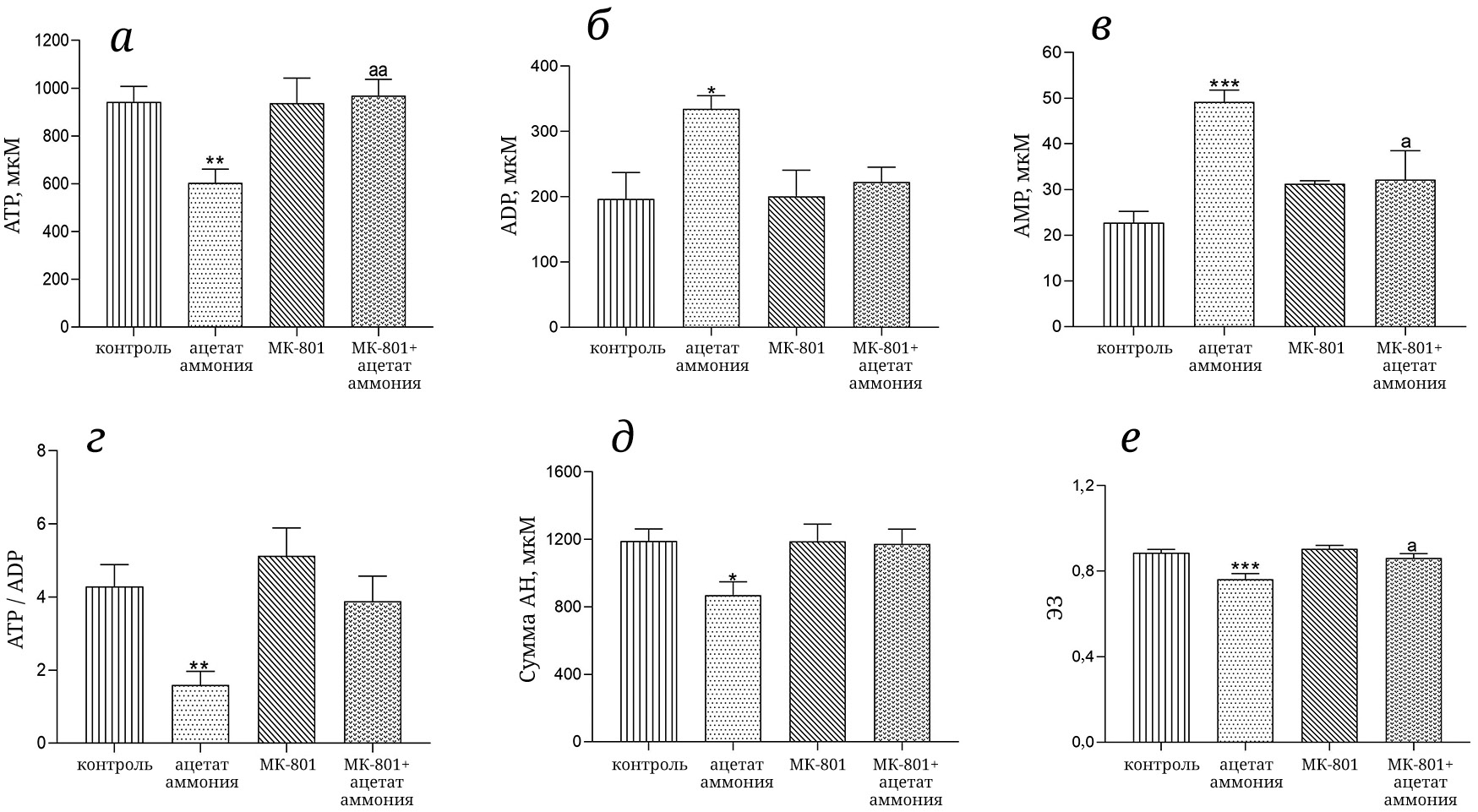Рис. 3. Концентрация ATP (а), ADP (б), AMP (в), отношение ATP/ADP (г), их суммарное содержание, АН (д), и ЭЗ (е) в эритроцитах крыс исследуемых групп (n = 10 для каждой группы). Условия введения препаратов, доза, время декапитации указаны в подписи к рис. 1. Методы определения концентрации ATP, ADP, AMP указаны в разделе «Материалы и методы». Концентрация метаболитов выражена в мкмоль/литр клеток (мкМ). Энергетический заряд рассчитывали по уравнению Аткинсона [44]: ЭЗ = (ATP + 0,5 ADP)/(ATP + ADP + AMP). Данные выражены в виде «среднее значение ± SEM». * p < 0,05, ** p < 0,01, *** p < 0,001 по сравнению с животными контрольной группы; a – p < 0,05, aa – p < 0,01 по сравнению с животными группы «ацетат аммония». Различия между группами анализировали с помощью метода ANOVA с поправкой Бонферрони