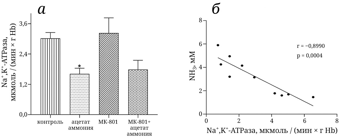 Как видно (рис. 4, а), в эритроцитах животных, получивших сублетальную дозу ацетата аммония, активность Na+,K+-ATPазы почти в 2 раза ниже (p < 0,05), чем у животных контрольной группы. МК-801 ни в одиночной инъекции, ни при сочетанном введении с ацетатом аммония не влиял на активность фермента. Это указывало на то, что аммоний-индуцированное торможение Na+,K+-ATPазы в эритроцитах не зависит от NMDA-R, а связано исключительно с действием аммония, что подтверждалось наличием достоверной отрицательной корреляции между концентрацией аммония, накопившегося в эритроцитах животных с ГА, и активностью Na+,K+-ATPазы (r = −0,899, p = 0,0004, рис. 4, б).