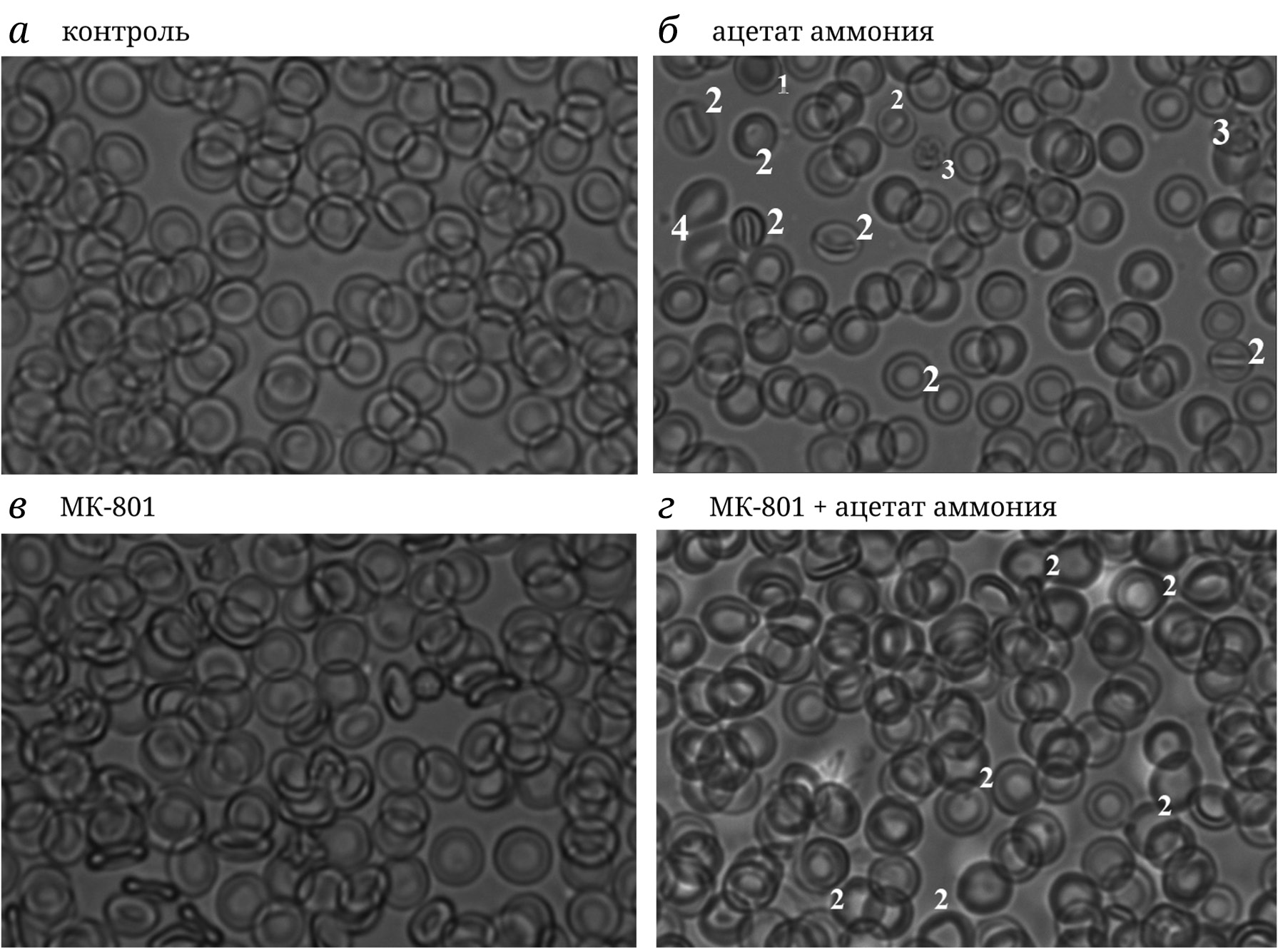 Влияние ГА и МК-801 на морфологию, концентрацию Hb и степень лизиса эритроцитов крыс. Микроскопическое исследование мазков крови показало, что для популяции эритроцитов животных с ГА характерна некоторая неоднородность, возникающая из-за трансформации дискоцитов-нормоцитов (рис. 5, а) в стоматоциты (рис. 5, б (2)) – клетки, практически не способные не только поддерживать прочность мембран, но и деформироваться в кровотоке [79]. МК-801 в одиночной инъекции заметно не изменял морфологию нормальных клеток (рис. 5, в), а при сочетанном действии с ацетатом аммония только частично способствовал восстановлению стоматоцитов до дисковидной формы, в результате чего, как можно видеть, большая часть клеток в кровотоке животных с ГА в присутствии МК-801 оставалась в виде набухших стоматоцитов (рис. 5, г (2)).