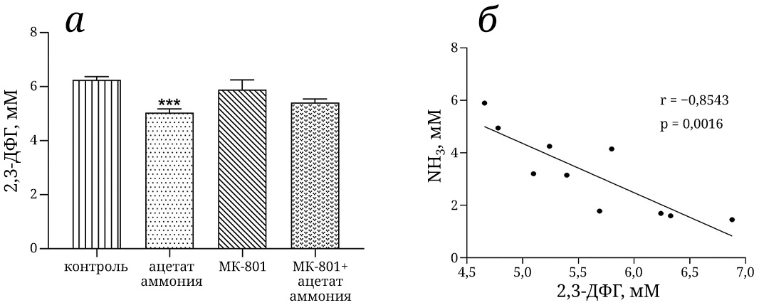 Рис. 6. Концентрация 2,3-ДФГ в эритроцитах крыс исследуемых групп (n = 10 для каждой группы) (а). Условия введения препаратов, доза, время декапитации указаны в подписи к рис. 1. Методы определения концентрации 2,3-ДФГ указаны в разделе «Материалы и методы». Концентрация метаболита выражена в ммоль/литр клеток (мМ). Данные выражены в виде «среднее значение ± SEM». *** p < 0,001 по сравнению с животными контрольной группы. Различия между группами анализировали с помощью метода ANOVA с поправкой Бонферрони. Для выявления взаимосвязи между концентрацией аммония в эритроцитах и концентрацией 2,3-ДФГ использовался коэффициент корреляции Пирсона (б). Анализ проводился с использованием программного обеспечения GraphPad Prism V8. Достоверная отрицательная корреляция между концентрацией аммония и активностью 2,3-ДФГ в эритроцитах крыс с ГА, r = −0,854, p = 0,0016