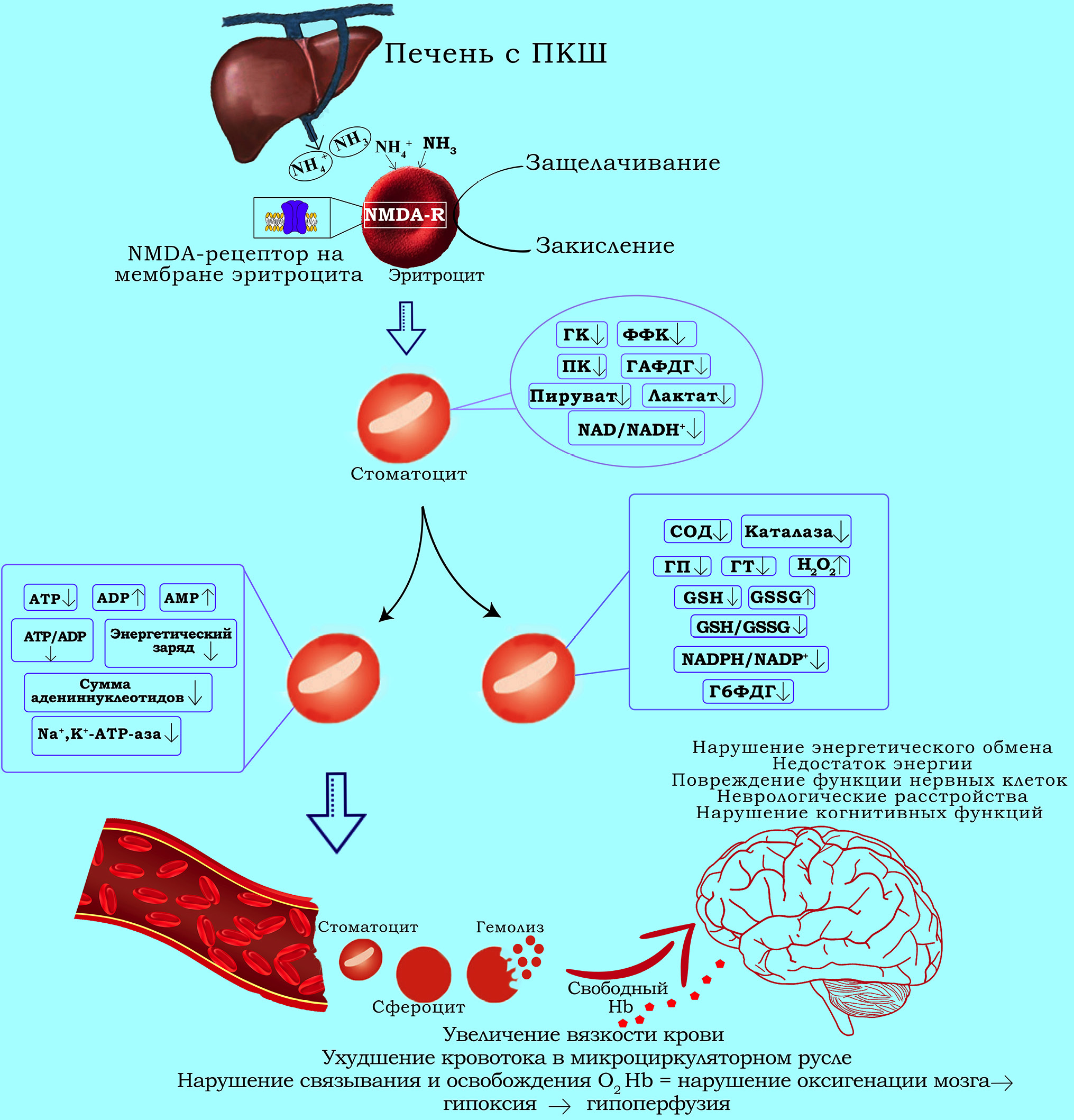 Блокада Na+,K+-помпы в эритроцитах животных с ГА, как показали наши исследования, не зависит от функциональной активности NMDA-R, тогда как морфологические изменения, переход нормальных эритроцитов в стоматоциты, нарушение регуляции объёма клеток, осмотической резистентности, усиленный лизис эритроцитов, накопление свободного Hb в плазме крови являются результатом токсического действия аммиака/аммония, частично сопряжённого с гиперактивными NMDA-R. Напротив, аммиак-индуцированное уменьшение активности гликолитических ферментов, внутриклеточной концентрации ATP, энергетического заряда и других показателей АН (кроме 2,3-ДФГ), по-видимому, полностью взаимосвязаны с Ca2+-NO•-зависимым сигнальным каскадом, запускаемым гиперактивными NMDA-R. Блокада Na+/K+-помпы, вызванная недостатком ATP, лежит в основе изменения формы эритроцитов (образование стоматоцитов), ухудшения способности к деформации и увеличения вязкости крови, ухудшения кровотока в микроциркуляторном русле [74]. Уменьшение концентрации ATP и 2,3-ДФГ приводит к нарушению связывания и освобождения кислорода Hb и, следовательно, к гипоперфузии [95], которая лежит в основе мультиорганных повреждений [89], в том числе неврологических расстройств и когнитивных нарушений [23, 96, 97], которые к тому же могут прогрессировать под действием окислительного стресса [16] и токсических эффектов внеклеточного Hb, накопление которого приводит к развитию несовместимых с жизнью осложнений [89, 121].
