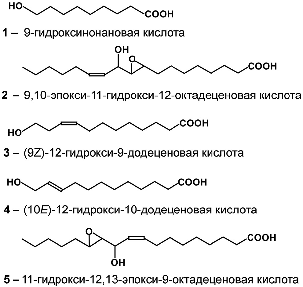 Принятые сокращения: АОС – алленоксидсинтаза; ГПЛ – гидропероксидлиаза; 9-Г(П)ОД – (9S,10E,12Z)-9-гидро(перо)кси-10,12-октадекадиеновая кислота; 13-Г(П)ОД – (9Z,11E,13S)-13-гидро(перо)кси-9,11-октадекадиеновая кислота; 9-Г(П)ОТ – (9S,10E,12Z,15Z)-9-гидро(перо)кси-10,12,15-октадекатриеновая кислота; 13-Г(П)ОТ – (9Z,11E,13S,15Z)-13-гидро(перо)кси-9,11,15-октадекатриеновая кислота; ГХ-МС – газовая хромато-масс-спектрометрия; ДЭС – дивинилэфирсинтаза; ЭАС – эпоксиалкогольсинтаза; Ме/ТМС – триметилсилилированное производное метилового эфира.