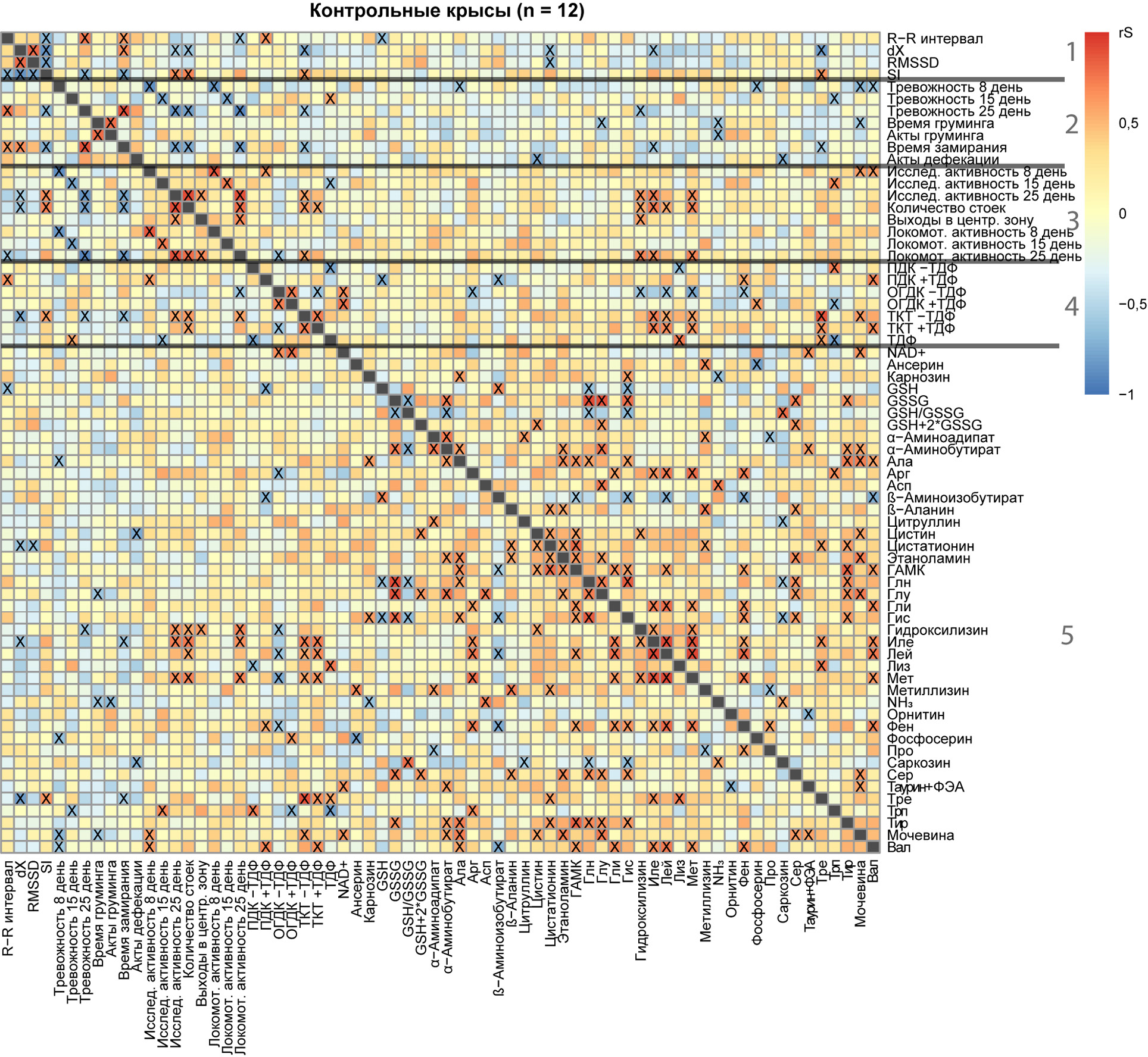 Рис. 7. Матрицы корреляций физиологических и биохимических параметров после хронического введения метформина/ампролиума. Выделенные горизонтальные линии делят параметры на пять групп: (1) параметры ЭКГ, (2) параметры тревожности, (3) параметры исследовательской и локомоторной активностей, (4) активности ТДФ-зависимых ферментов вместе с уровнем ТДФ и (5) уровни NAD+, аминокислот и родственных соединений
