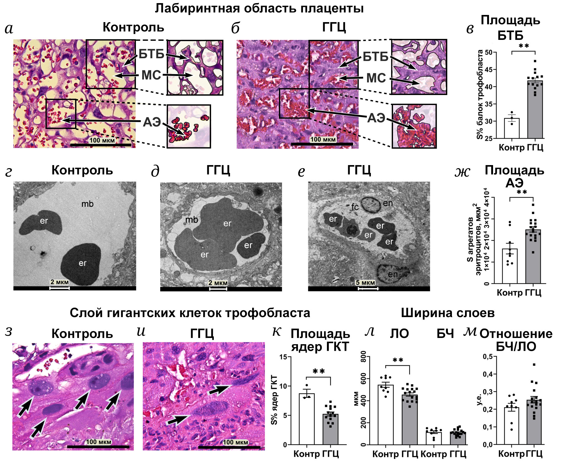 Рис. 4. Морфологические изменения в плаценте крыс на 20-й день беременности под влиянием материнской гипергомоцистеинемии (ГГЦ). а, б – Лабиринтная область плаценты с балками трофобласта (БТБ) и материнскими синусоидами (МС) в контрольной (а) и подопытной (б) группе. В выносках обозначены области БТБ и агрегатов эритроцитов (АЭ), площадь которых количественно анализировалась; окраска гематоксилин-эозин, ×200. в – Относительная площадь (S%) БТБ от общей площади области лабиринта. г–е – Электронограммы ткани плаценты контрольной (г) и подопытной (д и е) группы; mb – кровь матери (материнская синусоида), fc – капиллярный сосуд плода, er – эритроциты в просвете сосуда, на панелях д и е видны агрегаты эритроцитов, заполняющие просвет сосуда, en – эндотелиальные клетки стенки капилляра плода. ж – Площадь АЭ в лабиринтной области плаценты. з, и – Гигантские клетки трофобласта (ГКТ) в контрольной группе (з) и группе ГГЦ (и); окраска гематоксилин-эозин, ×400; стрелками обозначены ядра ГКТ; к – относительная площадь (S%) ядер ГКТ от общей площади слоя ГКТ. л – Толщина лабиринтной области (ЛО) и базальной части (БЧ) плаценты. м – Отношение толщины БЧ к толщине ЛО. На всех графиках данные представлены как M ± SEM. Для панелей в и к: n = 3 плаценты от 3 самок в контрольной группе, n = 14 плацент от 4 самок в группе ГГЦ; ж, л и м: n = 9 плацент от 5 самок в контрольной группе, n = 18 плацент от 6 самок в группе ГГЦ; ** p < 0,01, t-критерий Стьюдента