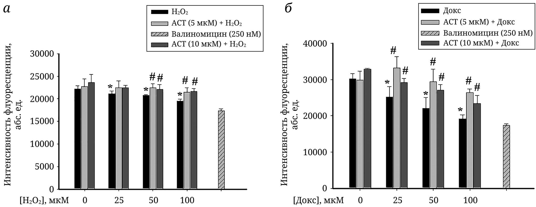 Рис. 4. Влияние АСТ, Н2О2 и Докс на изменение ΔΨм в клетках кардиомиоцитов Н9с2. Интенсивность флуоресценции интактных клеток использовали в качестве контроля (без обработки препаратами). а – Изменение интенсивности флуоресценции в присутствии АСТ (5 и 10 мкМ) и Н2О2; б – изменение интенсивности флуоресценции в присутствии АСТ (5 и 10 мкМ) и Докс. Валиномицин (250 нМ) использовался как положительный контроль. Данные представлены как среднее значение ± стандартное отклонение (n = 6); * p < 0,05 – значимое изменение по сравнению с соответствующим контролем (необработанные клетки); # р < 0,05 – значимое изменение по сравнению с Н2О2 или Докс