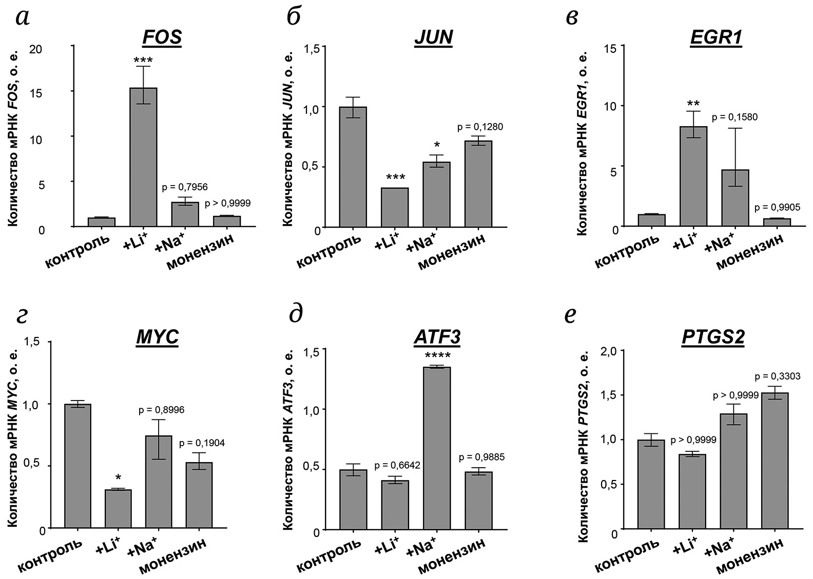 Рис. 3. Влияние 40 мМ LiCl, 40 мМ NaCl и 1,2 мкг/мл монензина, добавленных в культуральную среду, на содержание мРНК генов FOS (а), JUN (б), EGR1 (в), MYC (г), ATF3 (д), PTGS2 (е) в HUVEC. Клетки инкубировали в экспериментальных условиях в течение 1,5 ч. Значения представлены как среднее ± SE (n = 5). Значимые различия рассчитывали с помощью одностороннего ANOVA; * p < 0,05; ** p < 0,01; *** p < 0,001; **** p < 0,0001