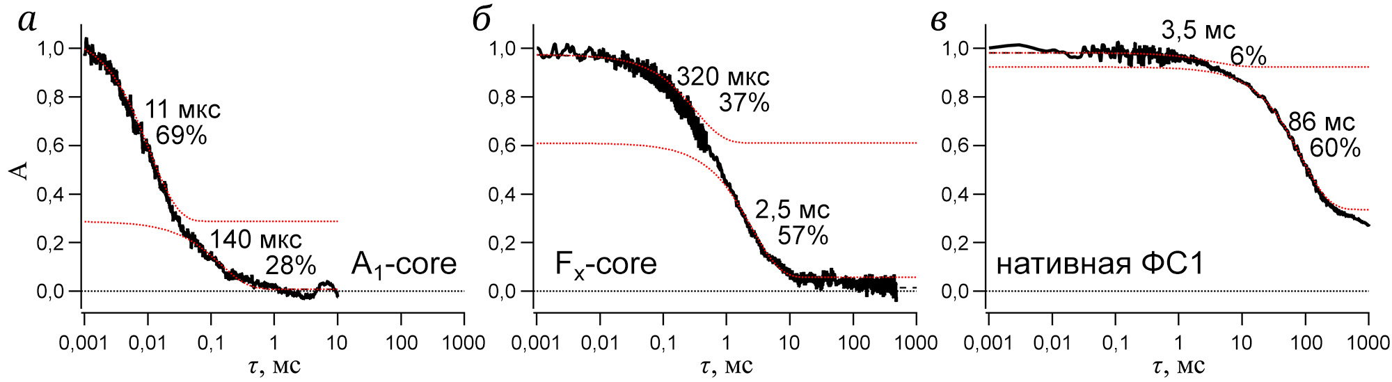 В кинетике рекомбинации зарядов при комнатной температуре в случае комплексов A1-core выявляются две компоненты с характерными временами (τ) ~10 и 140 мкс (рис. 3, а), которые соответствуют обратному переносу электрона с молекул филлохинона A1В и A1А в симметричных ветвях кофакторов [14, 26, 27]. В приведённых экспериментальных кривых доминирует более быстрая компонента с амплитудой почти 70%. Соотношение между быстрой и медленной компонентами рекомбинации варьирует в зависимости от условий приготовления препаратов A1-core и использованного штамма цианобактерий [13, 14] и, вероятно, отражает не только асимметрию образования ион-радикальных пар A и В в симметричных ветвях редокс-кофакторов А и В, но и возможное повреждение и частичное удаление молекул филлохинона из сайтов А1, происходящее при выделении препаратов A1-core.