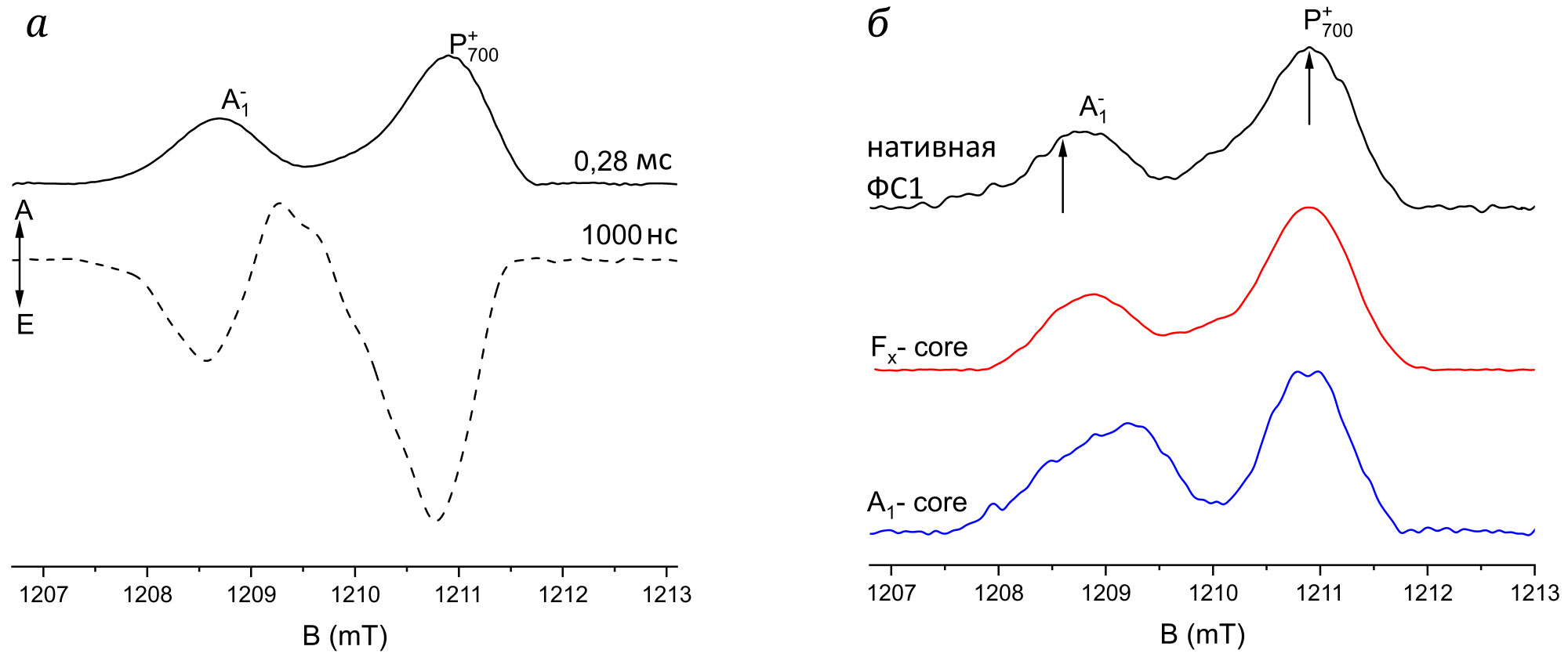 На рис. 1, б и в схематически изображены нативный комплекс ФС 1 и комплекс A1-core, в котором отсутствуют субъединица PsaC и железо-серные кластеры FX, FA и FB. На рисунке стрелками обозначены различные прямые и обратные реакции переноса электрона. Сплошными стрелками на рисунке обозначены реакции, регистрируемые в наших экспериментах, а пунктиром – перенос электрона, который происходит быстрее, чем время разрешения установки импульсной ЭПР-спектроскопии (см. детали в подписи к рисунку и в обсуждении результатов).